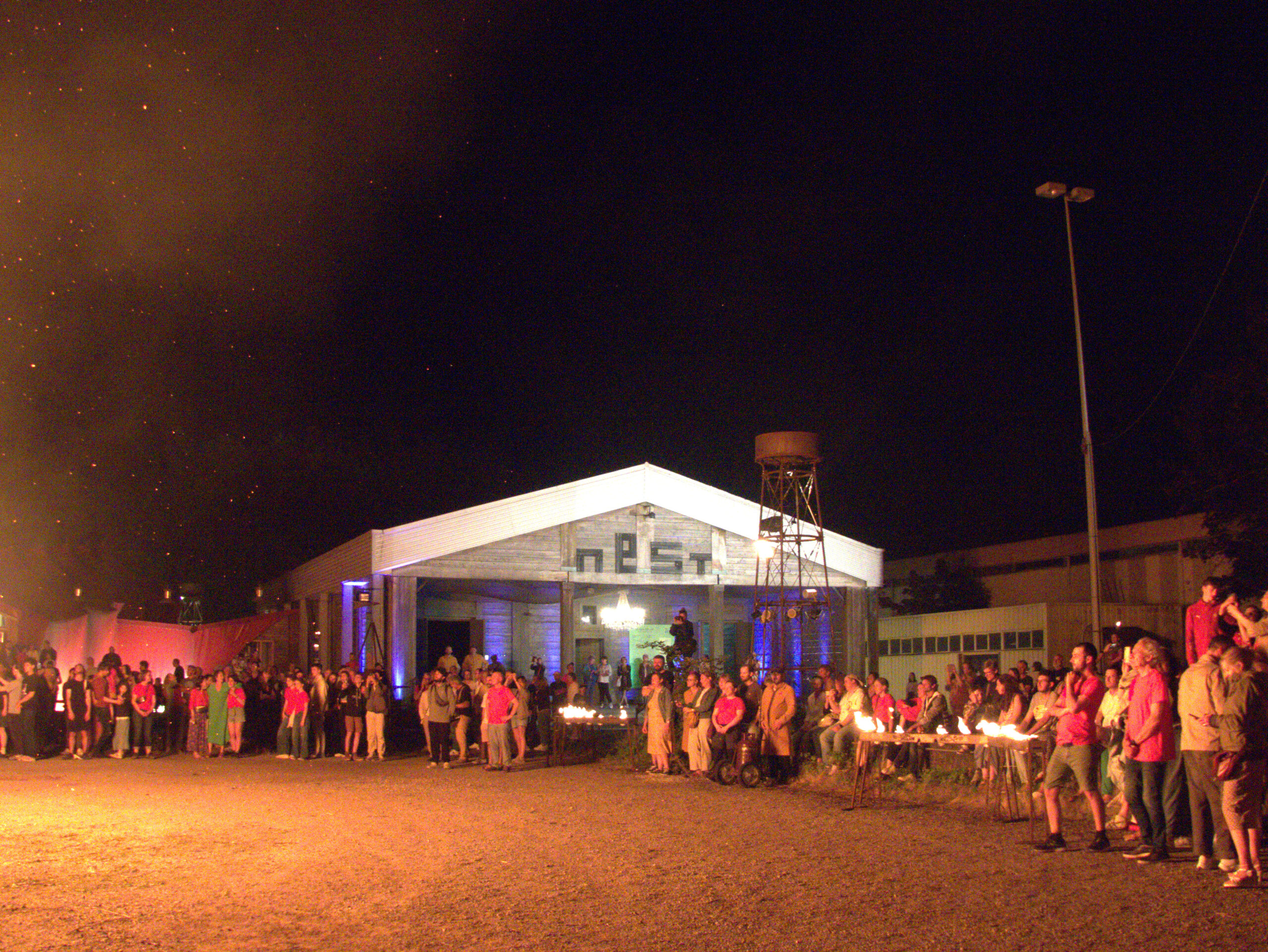 Hommage à la matière inflammable dont était fait ce théâtre tout comme au passé sidérurgiste du territoire, le feu fait figure de héros de cette soirée d’adieu. Des lampions éclairés de vraies flammes, d’immenses photophores de métal et autres formes incandescentes donnent vie à une nuit qui tombe peu à peu. Que les trois coups du spectacle retentissent et nous voilà plongé.es dans des ténèbres rehaussées des points lumineux de briquets éclairant légèrement le visage des acteur.rices.
