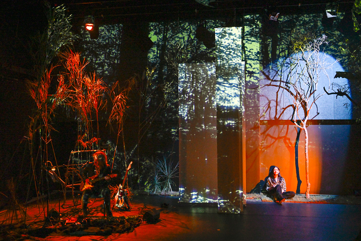 Quand j’ai réfléchi à la scénographie que je désirais pour ce spectacle, je me suis dit qu’il fallait absolument quelque chose d’immersif, une scénographie dans laquelle le public aurait envie de s’enfouir. Non pas un univers figuratif mais plutôt l’espace mental de la narratrice. Et donc je me suis dit qu’il fallait du végétal, qu’il fallait construire un univers faussement naturel, et j’ai naturellement pensé au plasticien Johnny Lebigot. C’est un artiste qui travaille beaucoup sur le mélange des trois règnes, le végétal, le minéral, l’animal, et qui fabrique à partir des résidus de ces trois règnes des chimères, par exemple des arbres qui ont l’air naturels mais qui ont des formes un peu étranges, et qui en fait sont constitués d’une multitude d’essences. Johnny Lebigot a proposé un espace pour ce récit qui tient à la fois de la forêt, du bayou et du voyage.