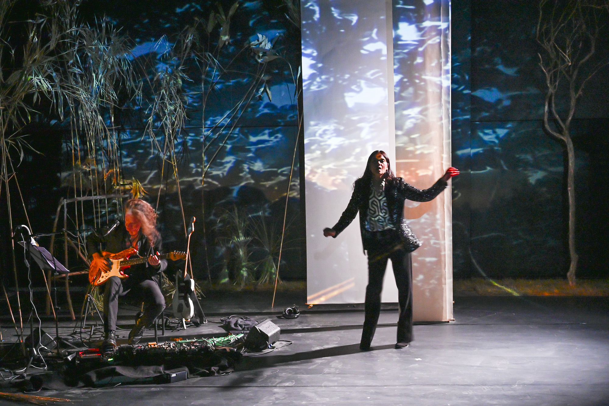 La musique devient comme le prolongement de la pensée du personnage, de ses émotions, et c’est ce qui va aussi nous emmener dans une dimension très road-movie, avec des accents tantôt rock, tantôt minimalistes, dans une pop dark urbaine et sensuelle, avec des textures que créé en permanence Yan Pechin, qui chaque jour improvise une partie de sa partition. Cela confère au spectacle une dimension de l’ordre de la performance qui s’accorde très bien avec la comédienne Véronique Sacri, une interprète très intense et instinctive qui traverse aussi ce récit, ce road-trip comme une performance.