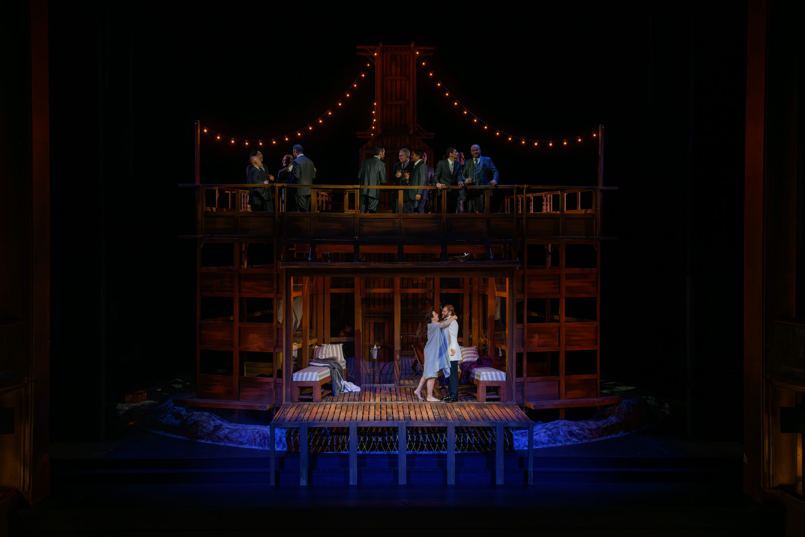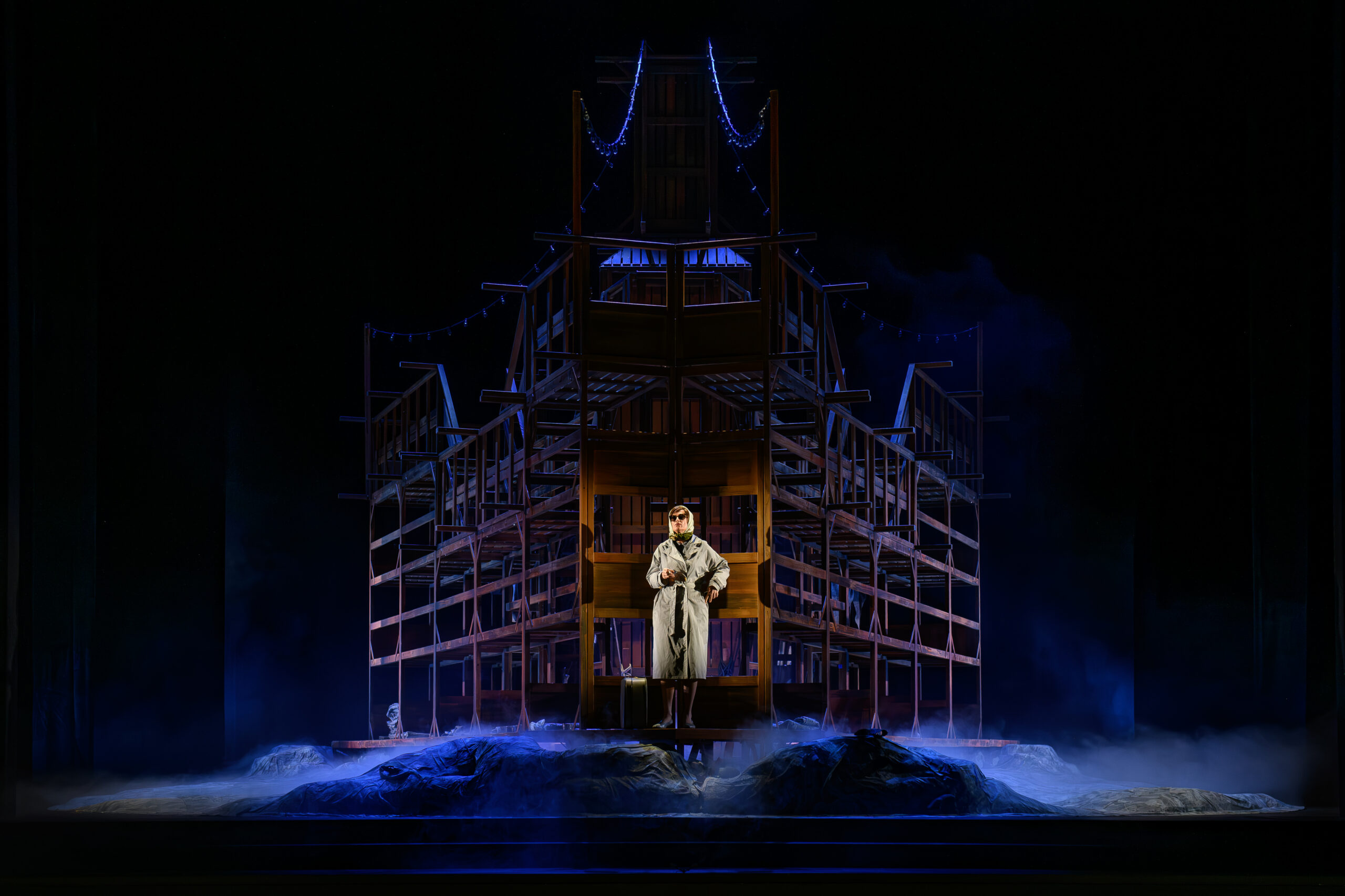 Une seule structure en bois est à la fois la cabine du paquebot (en haut) et les baraquements (en bas), permet le jeu du miroir entre le passé et le présent qui ravage la conscience de Lisa. Les costumes de Michael D. Zimmermann sont glaçants de réalisme. On y retrouve les pyjamas rayés et les crânes déplumés des prisonniers, les uniformes impeccables des SS et les fabuleuses tenues de soirée de Lisa, Walter et les passagers du paquebot. Pour ne rien gâcher, tous les interprètes ont livré une performance vocale exceptionnelle et un jeu scénique digne des meilleurs comédiens.