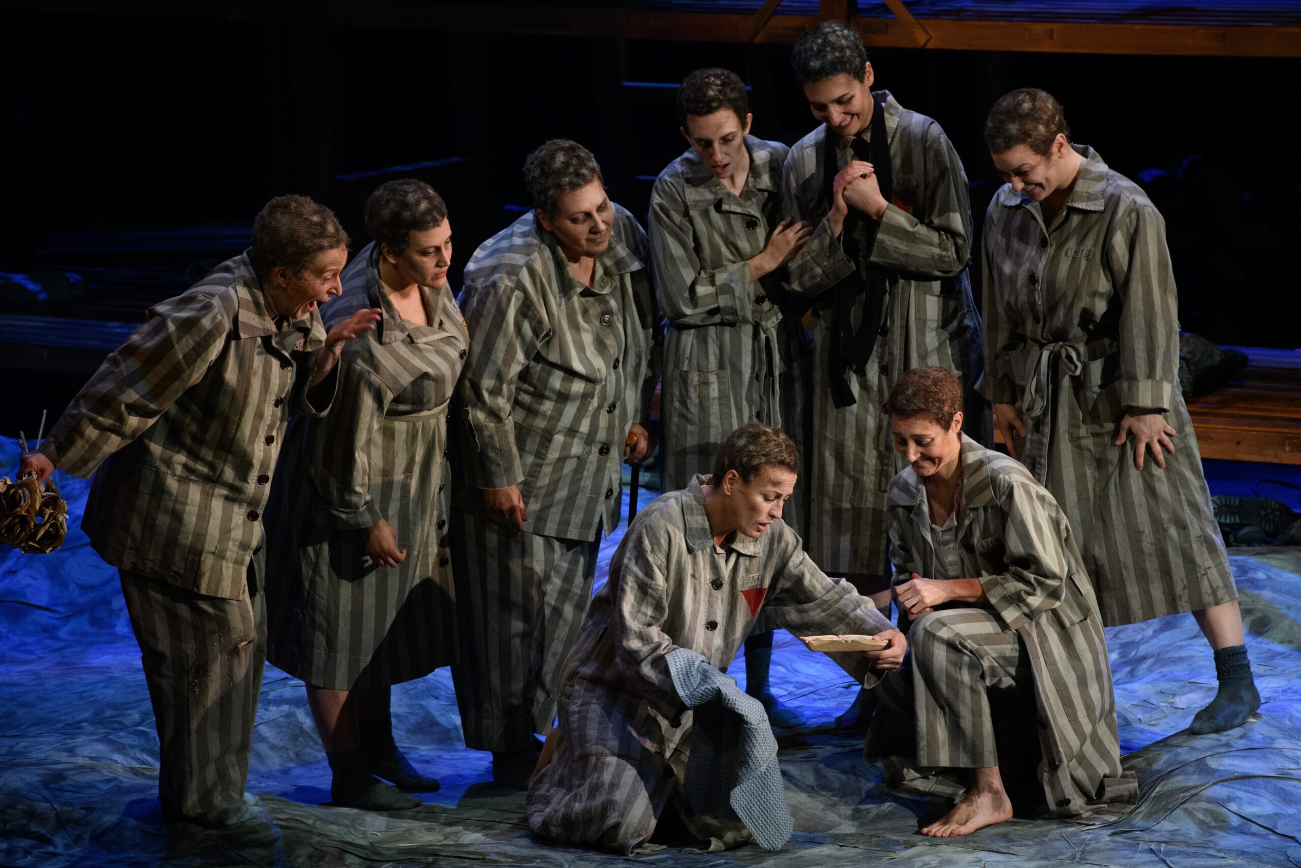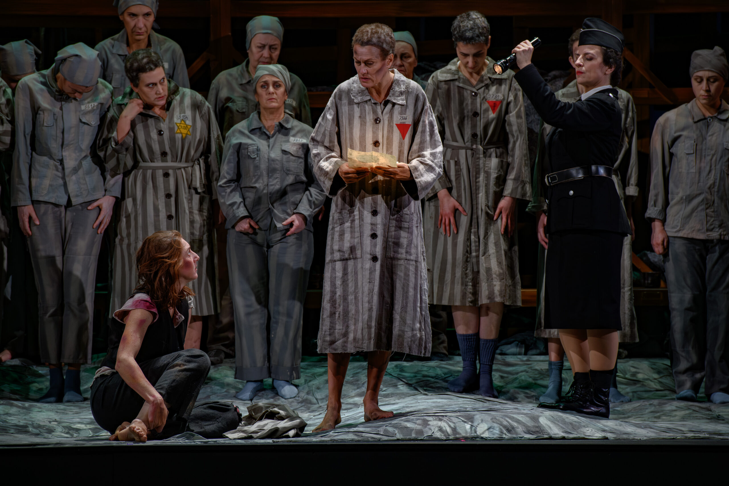 Tout bascule pour Lisa lorsqu’elle aperçoit, parmi les passagers, celle qu’elle reconnaît comme une ancienne détenue, Marta. Un autre monde émerge des profondeurs de la structure en bois : celui des baraquements remplis de femmes en pyjamas rayés. Bronka, Yvette, Krystina, Vlasta, Hannah, Katya sont des femmes vivantes et parfois même joyeuses ou amoureuses qui chantent, chacune dans sa langue – polonais, français, yiddish, tchèque et russe – leur souffrance, leur peur et leur espérance, avant de devenir les numéros 4719, 4313, 3575, 3154 et 2731, projetés sur le mur noir pendant le dernier air de Marta, la seule survivante du groupe.