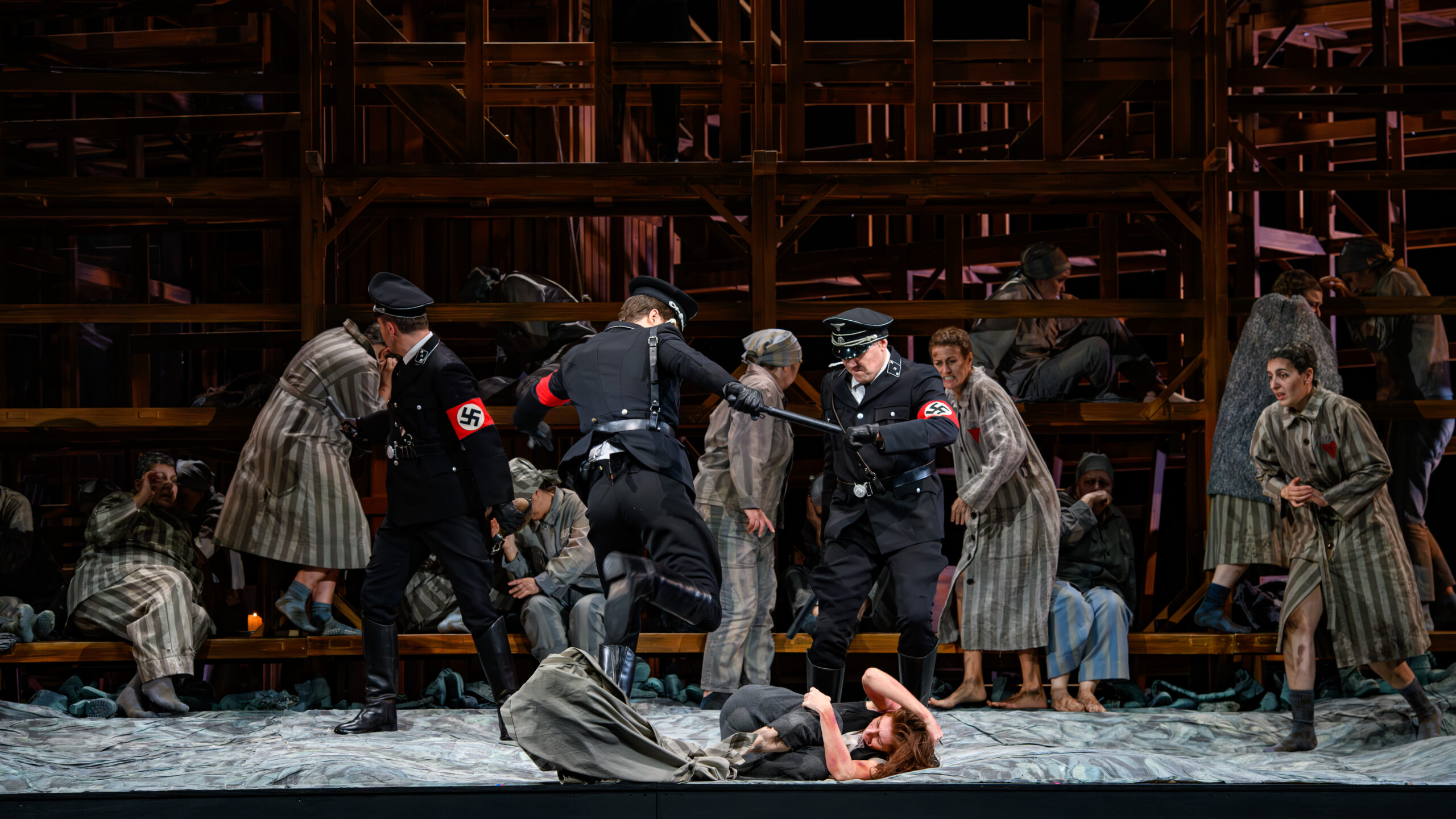 La contralto allemande Manuela Schütte est glaçante dans le rôle de la kapo : ses interventions frappent comme des coups de fouet. Les SS – le baryton Damien Gastl, la basse Baptiste Bouvier et le ténor Zachary McCulloch envoient leurs brèves mais décisives répliques avec une brutalité froide et la basse turque Hazar Mürşitpinar en Vieux Passager complète cette formidable équipe d’interprètes.