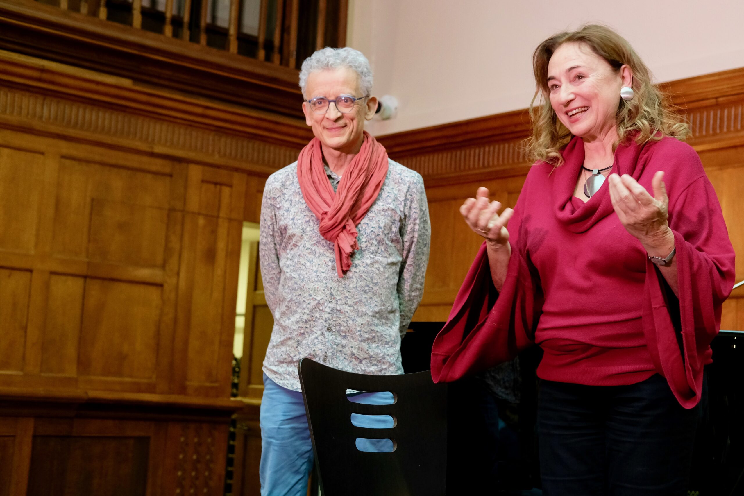 Comme complément, Kataeva et Oldak jouent le Concertino pour deux pianos, une pièce d’une durée d’exécution d’une dizaine de minutes, composée par Chostakovitch en 1953 à l’intention de son fils Maxime. « C’est comme un bon verre de champagne », Kataeva introduit le Concertino qui commence par deux motifs contrastés : l’un grave, l’autre hymnesque. Après cette introduction sérieuse, la musique devient légère et dansante, reflétant sans doute l’optimisme qui marque la période après la mort de Staline en mars 1953. Dans leur enregistrement historique pour Monitor de 1956, le père et fils Chostakovitch jouent l’Allegretto exubérant dans un rythme endiablé qui rappelle les courses poursuites de Tom et Jerry. Laurence Oldak et Irina Kataeva n’atteignent pas tout à fait la vitesse ni l’unisson organique des Chostakovitch – même si on sent chez Kataeva la volonté et la capacité d’aller plus loin – mais le duo fait apparaître une bonne dose de bulles qu’offre la pièce. Les spectateurs applaudissent chaleureusement, avant de rejoindre la queue pour féliciter les deux musiciennes de leur superbe prestation. La première journée du festival a mis la barre haut et ceux qui comptent revenir le lendemain s’en font déjà une joie.