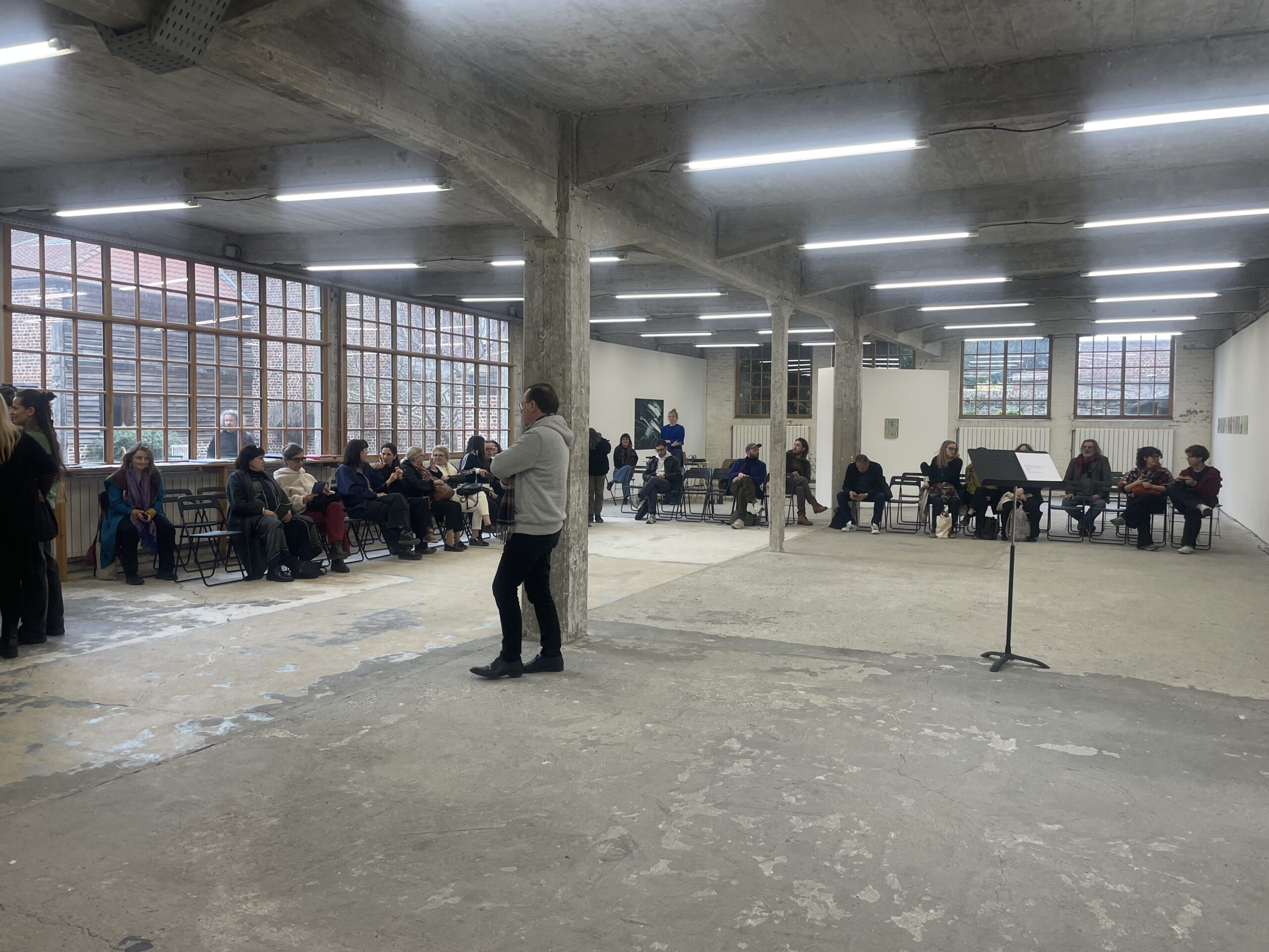 Champs de Mars, de Mélodie L’Asselin et Simon Cappelle, prolonge cette recherche scénique. Le dernier moment de notre journée se déroule dans le bel espace de L’H du Siège, centre d’art contemporain de Valenciennes. Dans cet ancien atelier de briques, au milieu des œuvres de Jaeyoung Choi, nous découvrons en primeur une lecture exploratoire du texte du troisième volet d’une trilogie consacrée aux meurtres commis dans la « Zone Deûle » à Lille, après Citadelle et Reconstitution.