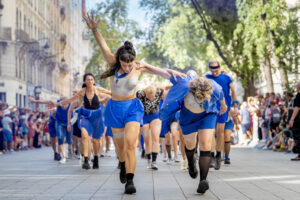 Sous un soleil éclatant et une chaleur estivale, la Biennale de la danse de Lyon a retrouvé ce dimanche son grand Défilé, moment festif et populaire qui, depuis 1996, transforme les rues en scène à ciel ouvert. Né d’une idée de Guy Darmet, ce défilé s’est imposé comme un rendez-vous incontournable où artistes et amateur·rice·s partagent l’espace public dans un même élan créatif. Cette édition a rassemblé un public extrêmement nombreux, venu applaudir la richesse des cortèges : d’Annonay à Villeurbanne, du Puy-de-Dôme à Annecy, chaque groupe a offert sa vision, entre traditions revisitées, rituels en fête et énergies urbaines. Le défilé s’est ouvert avec l’énergie solaire d’Abou Lagraa et Nawal Aït Benalla, bercée de rythmes berbères électro, avant de plonger dans l’hommage subtil à West Side Story d’Aïcha M’Barek et Hafiz Dhaou. Plus loin, le futurisme dystopique de Tom Grand Mourcel rencontrait les danses populaires andalouses de Kadia Faraux, tandis qu’Aina Alegre déployait une parade bleue et argent inspirée des fêtes catalanes. Bouba Landrille Tchouda célébrait les rituels du monde au son d’une batucada endiablée, quand Anne Le Batard et Jean-Antoine Bigot apportaient, avec leurs Palomilladas, un souffle canaille venu du Pérou. Abdou N’Gom faisait fusionner Hip-Hop et Lindy-Hop dans un vibrant Let’s Re-Jam, avant que Diego Dantas, depuis Rio, n’embrase la place Bellecour dans une clôture queer, entre résistances, électro et joie collective.