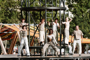 Le rendez-vous est pris Place de la République. Le public, nombreux, est au rendez-vous ; les passant·e·s, elles et eux, ne savent pas encore ce qu’il va se passer là. Volmir Cordeiro apparaît. Il a comme particularité d’être immense, quelque chose comme deux mètres de haut. Il surgit pile au milieu de cette esplanade ponctuée d’une fontaine grande comme une piscine olympique. Il est accompagné du percussionniste Washington Timbó, en micro-short et coiffure verticale. Volmir a les yeux entourés de halos oranges et il est tout vêtu de noir. Son premier geste met tout le monde au pas. Il se pose les deux jambes écartées, lève les bras, les croise en haut et jette une jambe à l’arrière. Il martèle comme ça un message qui impose de le regarder, au rythme des coups de tambour qui sont comme des coups de feu. Ensuite, il s’empare de tout l’espace, dans un silence et une écoute époustouflants dans un contexte de spectacle gratuit présenté en plein air. La fontaine devient un podium qu’il arpente tout en écrasant la haine et en saluant la vie. Ses pas, parfois teintés de salsa, n’ont pas manqué de courses rapides et de passages au sol, à quatre pattes, aux allures félines. Cette pièce qui date de 2015 n’a pas perdu en modernité ; au contraire, elle s’inscrit dans un monde toujours plus en guerre, et plus que jamais scander et danser les mots de Bertolt Brecht, qui ordonne de vivre, est essentiel.