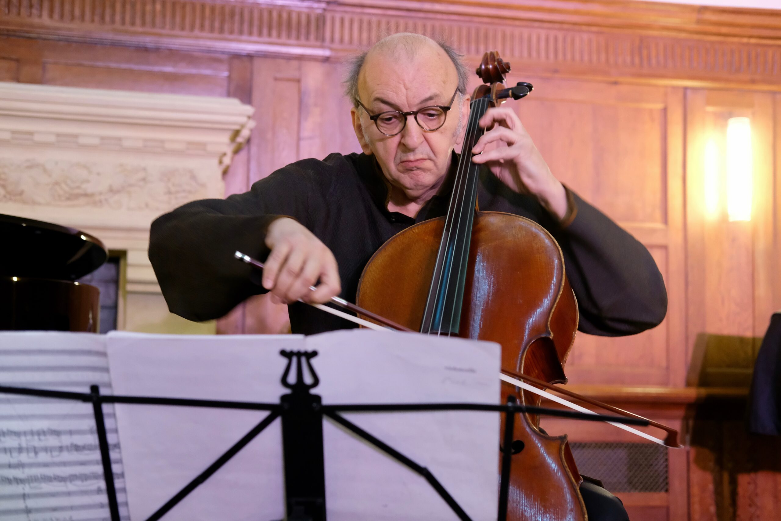 Pour préparer le public à l’expérience musicale qu’il allait vivre, Christopher Roy partage les consignes d’Oustvolskaïa pour l’interprétation du Grand Duo. « Les deux instruments doivent être le plus loin possible l’un de l’autre, le piano doit être ouvert et le violoncelle doit être sur un podium ». Roy nous explique que son luthier Bernard Sabatier, présent dans la salle, lui avait fabriqué une boîte à résonance sur laquelle il posera son instrument. Ensuite, le violoncelle doit imiter le pupitre de la contrebasse dans le troisième mouvement et – sourit Roy en articulant la dernière instruction de la compositrice : « L’œuvre doit être jouée de façon géniale ». La barre a indéniablement été mise haut.