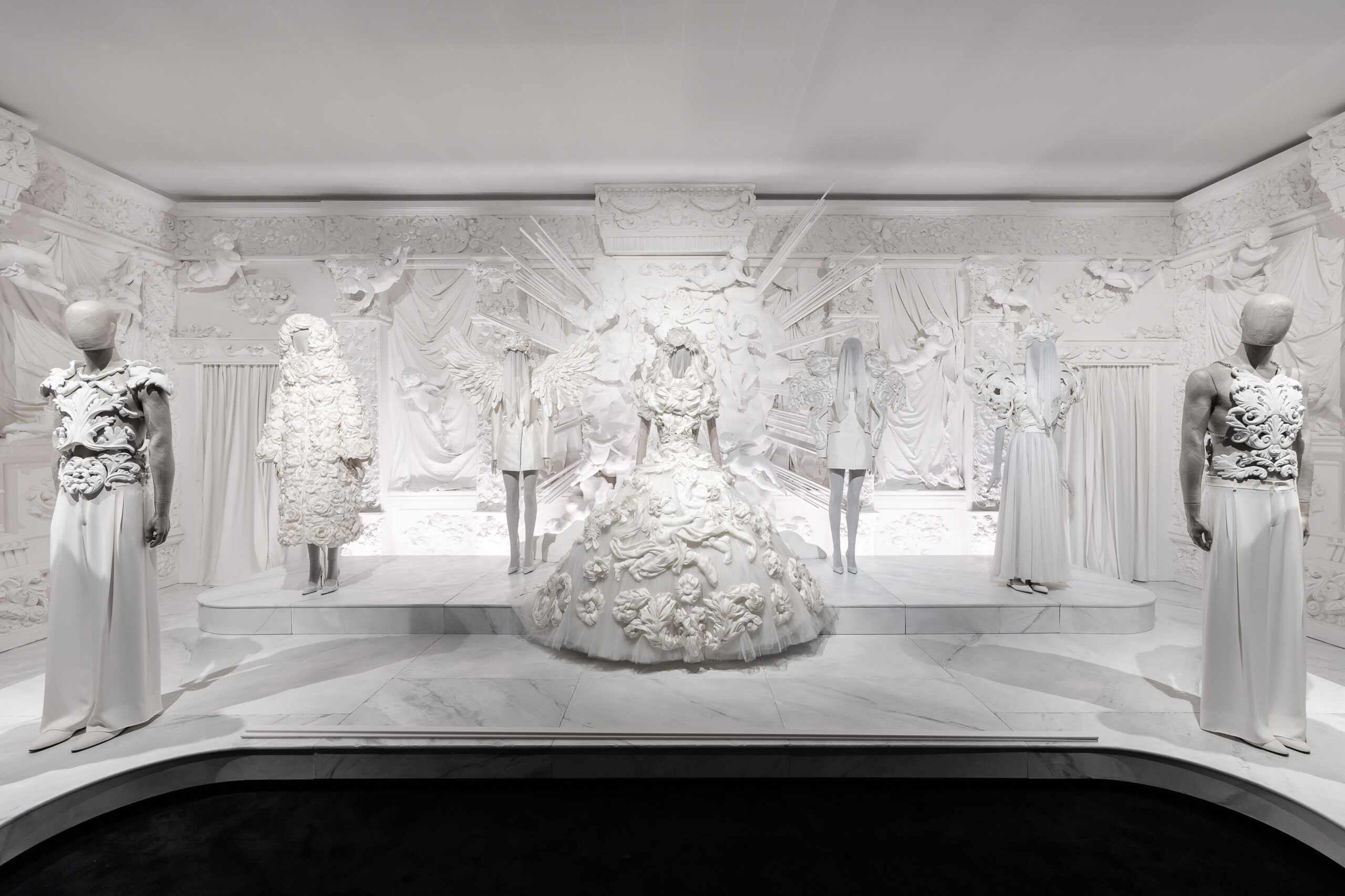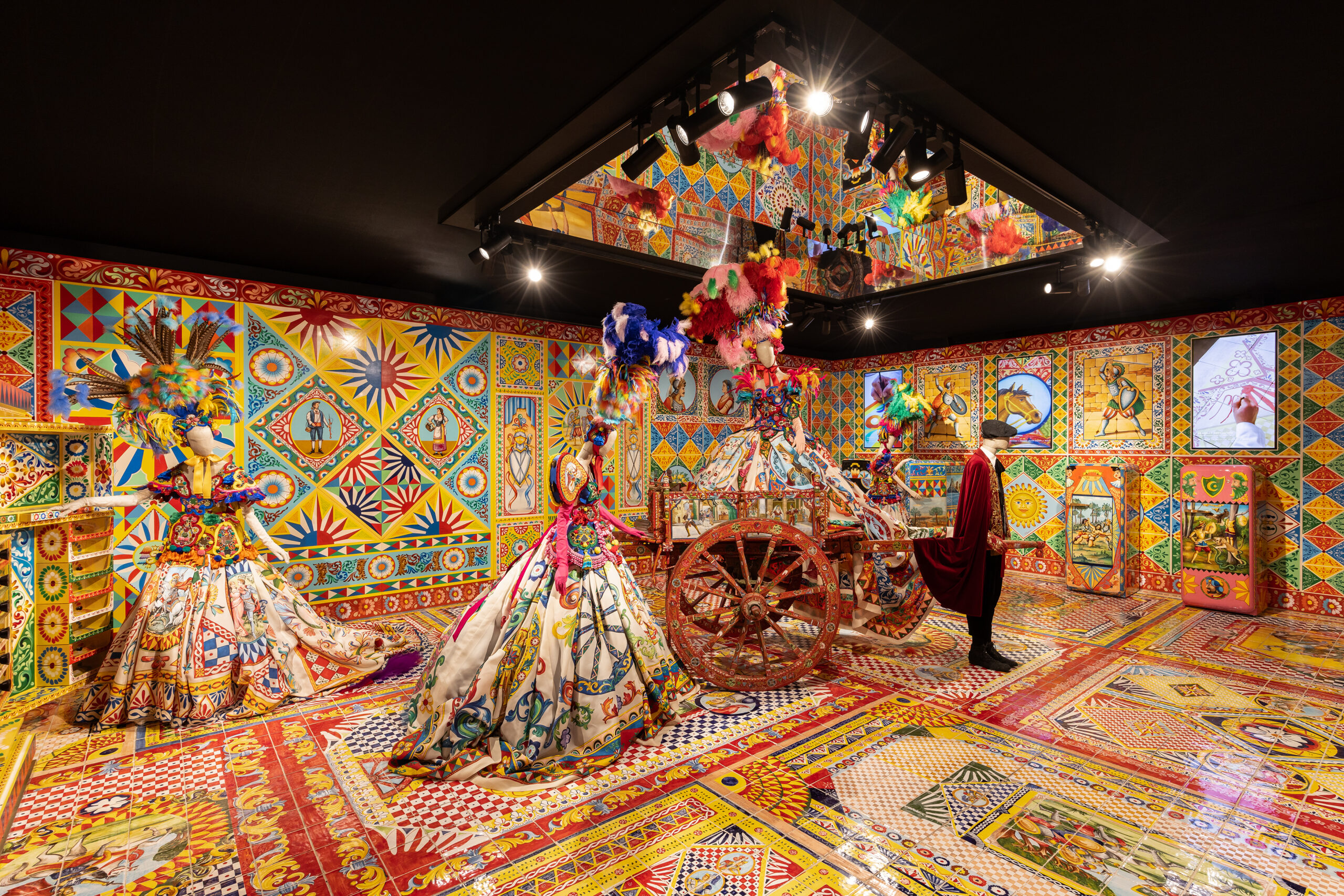 En effet plus encore que les bijoux, les dentelles, les délirantes hauteurs de talons et les lourdeurs orientalistes des bijoux, entre ombres et lumières, ce sont les miroirs qui sont omniprésents dans cette exposition qui se vit comme un spectacle immersif. La musique change, on passe de tableaux figuratifs en création de bijoux et l’on se regarde entre spectateurs et spectatrices, et souvent soi-même entre deux corsets et une cape. Alors que les mannequins se regardent, se répondent et nous tournent parfois même le dos dans de grands ensembles sculpturaux, c’est notre regard qui leur donne vie. Notre regard qui se reflète dans les glaces, au sol, au plafond et sur les murs, pour mieux retomber sur des paysages italiens, des mosaïques de byzantines ou sur le stuc blanc d’un paysage de vêtements baroques. À la fois féérique dans sa scénographie et très grand public dans sa manière d’emporter toutes les générations dans une Dolce Vita pleine d’yeux colorés, cette exposition assez unique imaginée par conçue par Florence Müller, l’Agence Galuchat et produite par IMG est précise et précieuse sans jamais être élitiste. Elle redonne toutes les couleurs de l’Italie à la «Haute couture » de Dolce&Gabanna et elle représente la mode et le monde comme une grande mise en scène.