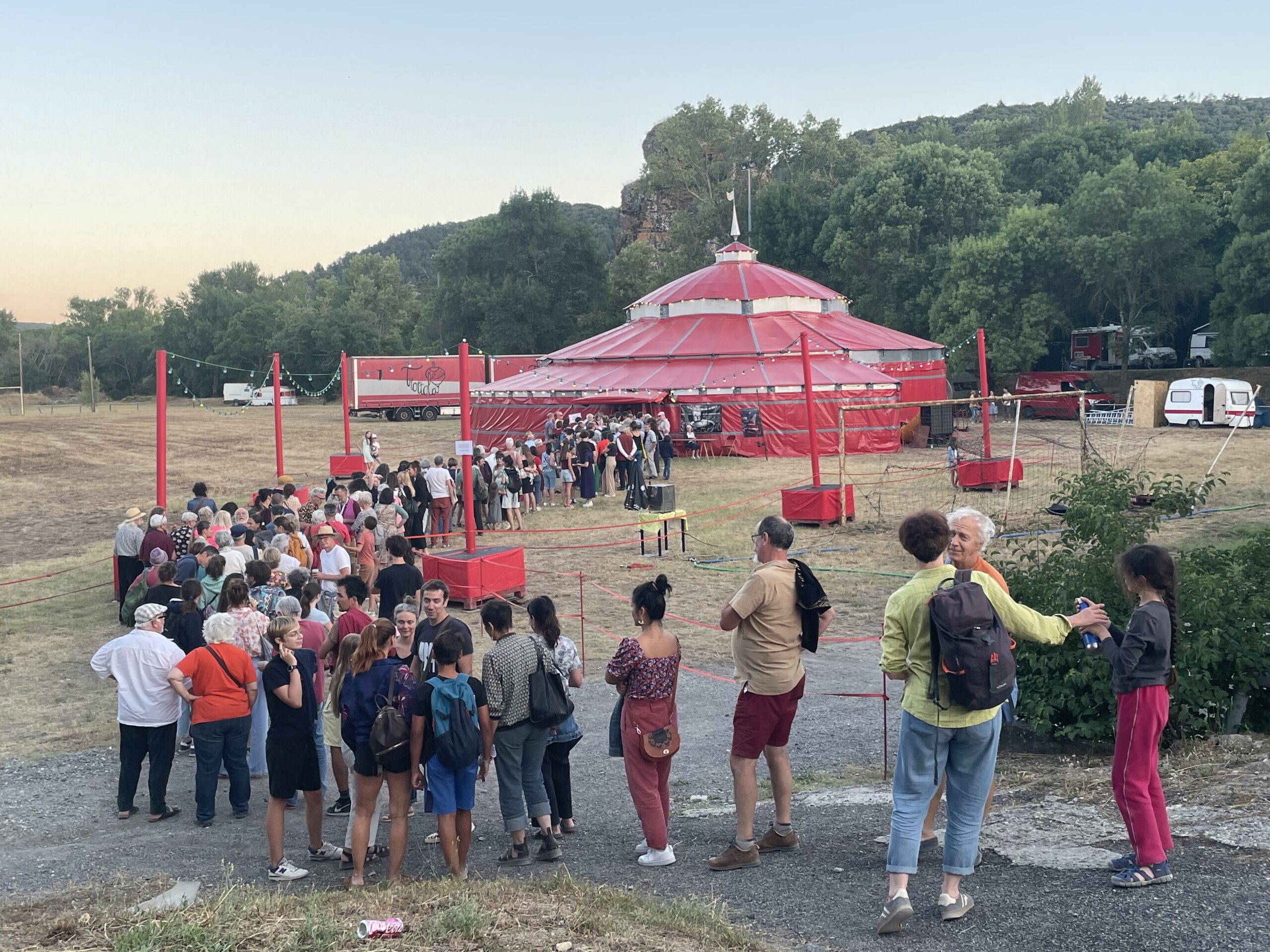 C’est donc sous les lampions, au son joyeux d’une radio locale et selon un menu concocté par des associations également locales, que se tient le cœur battant et très social du festival. En ce centre névralgique qui s’appelle « La Carbunica », les cigales couvrent les voix jusqu’au coucher du soleil, ça sent la sève, la citronnade est fraîche, le vin semble tombé des ceps qu’on a traversés pour venir et les générations se mélangent pas seulement autour du spectacle mais aussi autour de la pratique du cirque. Au festival d’Alba, on est engagé, éco-responsable, l’on paie ses consommations avec de la monnaie locale et verte – les « carbus » – et surtout, on a le sourire. La plupart des billets et des ateliers sont déjà réservés avant même que le festival commence, mais de grands panneaux solidaires permettent de les échanger et aussi de faire du covoiturage. C’est donc un public familial – nourrissons compris – enthousiaste et très impliqué qui se retrouve à Alba-la-Romaine pour célébrer tous les arts du cirque.