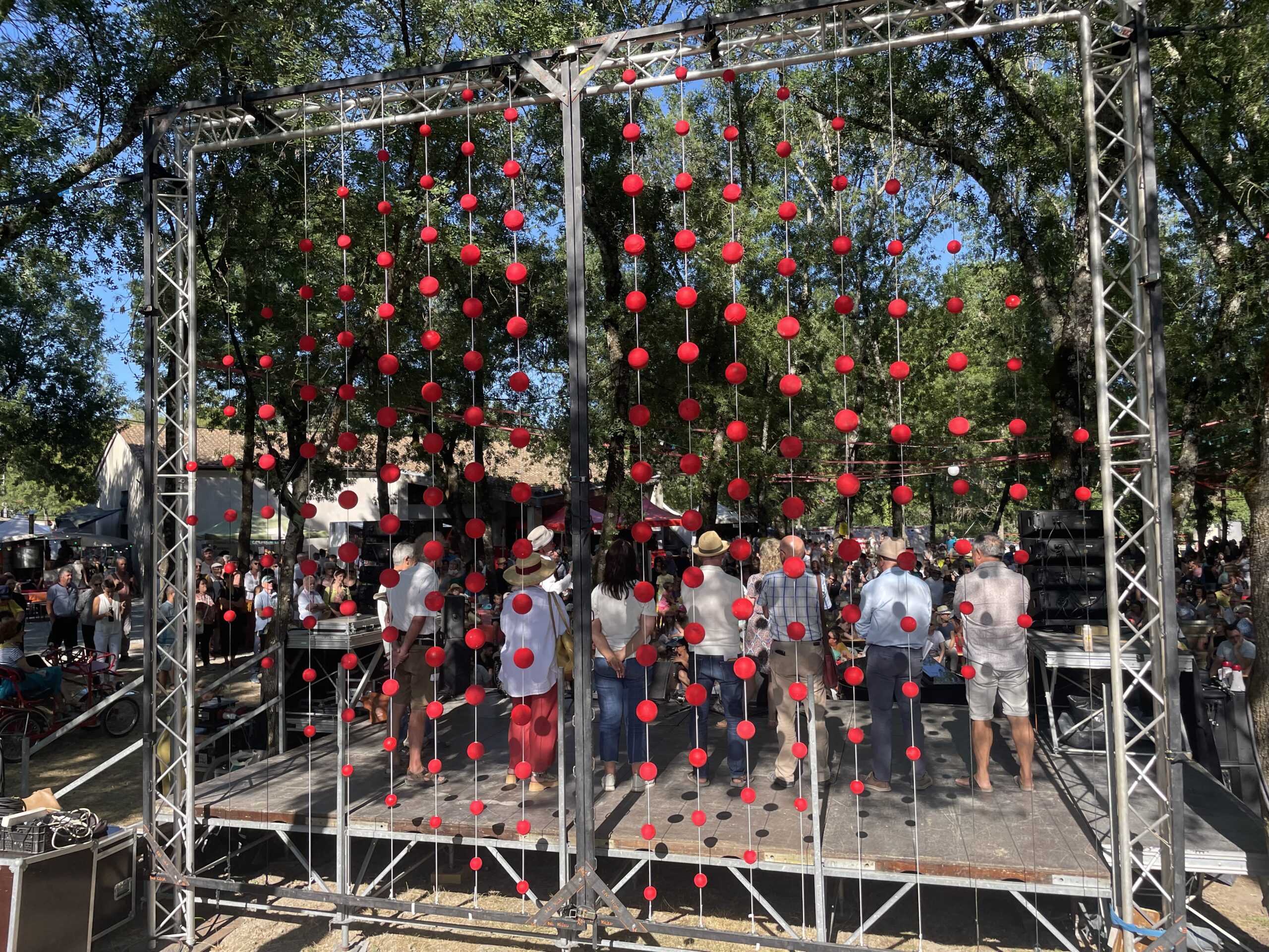 Pour l’ouverture officielle, Alain Raynaud, le directeur du festival, avait mis son plus beau costume rayé et son nez rouge pour introduire, avec son franc-parler et son abondance de mots, les discours des « huiles locales » qui, aussi institutionnelles soient-elles, ont chacune parlé haut et fort pour la défense de la culture. Quelques notes de musique ont accompagné les discours, et surtout un « Summertime » puissant de la cheffe de chœur. Car union de deux chœurs, il y a eu, comme une grande surprise humaine, avec une cinquantaine de voix qui sont sorties de sous les arbres de part et d’autre, puis réunies pour chanter cette soirée qui ouvre cinq jours de partage…