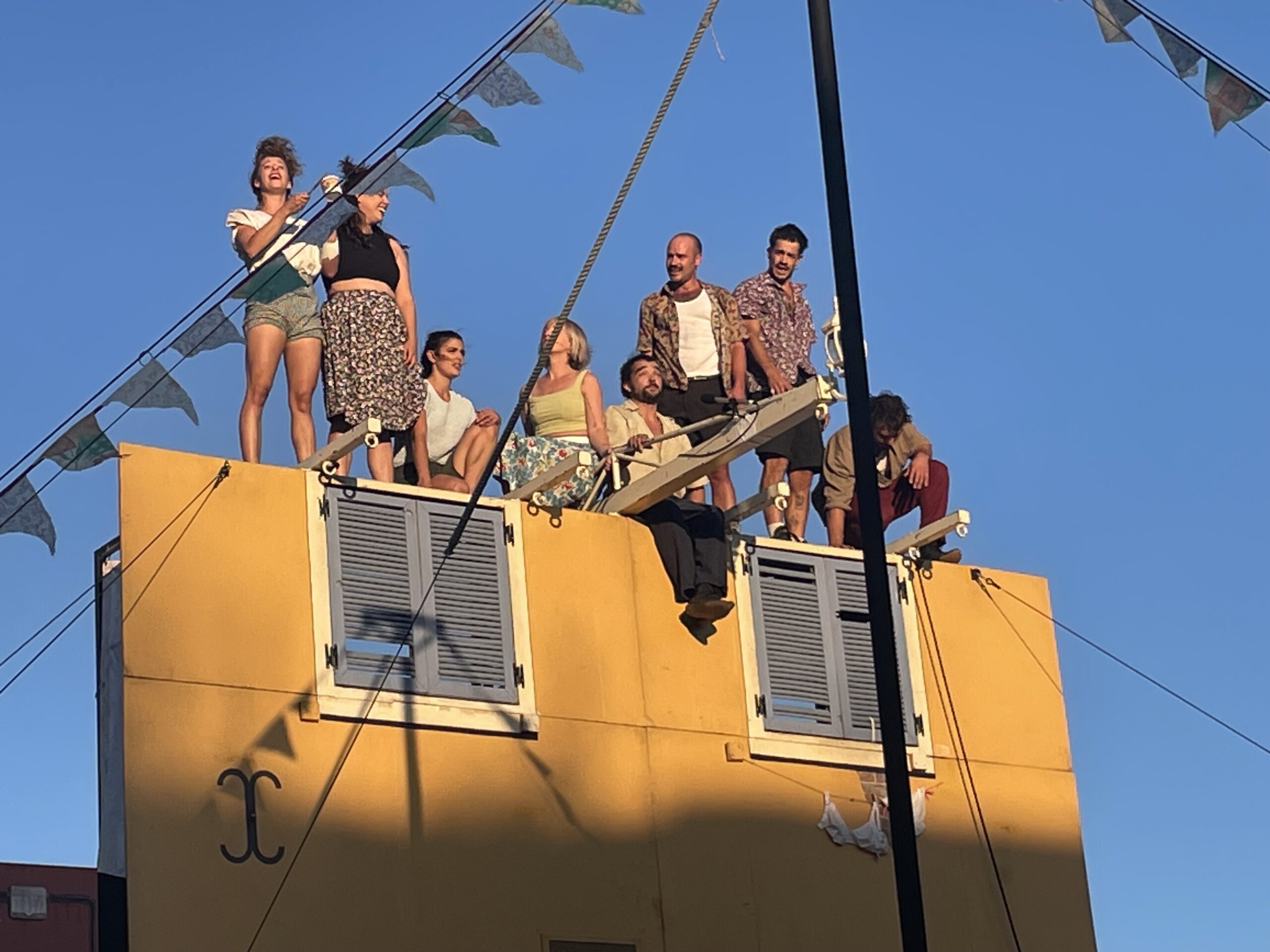 Tout a commencé à la verticale, à 19h45, avec l’ouverture des fenêtres d’un immeuble où il semble faire bon vivre, avec de jolis volets en bois, des fleurs et des tables à roulettes sur une terrasse, et surtout des lampions qui permettaient une ascension de barre lisse. Et tout a commencé comme un réveil matin et un rassemblement loufoque. Avec une B.O. exceptionnelle et surprenante où Pierre Lapointe côtoie Yom, Régine, du jazz manouche, et… la Compagnie Créole, les huit amis ont dansé, chanté, un peu parlé et surtout proposé une série d’expériences qui nous ont fait retenir notre souffle et crier d’admiration : les corps tombaient des fenêtres, ascensionnaient à deux ou trois enlacé·e·s le long de la barre, se postaient à deux ou trois sur les épaules, se rattrapaient sur les tables. Les disciplines du cirque, stricto sensu, sont classiques : chaises, barre russe, bascule… et néanmoins, tout a lieu dans une énergie, un mouvement, une fraîcheur qui semblent renouveler le genre. Le final prend une très jolie hauteur a cappella et nous fait penser que ces mariés de la 6e édition nous rendront longtemps heureux et auront beaucoup d’enfants…