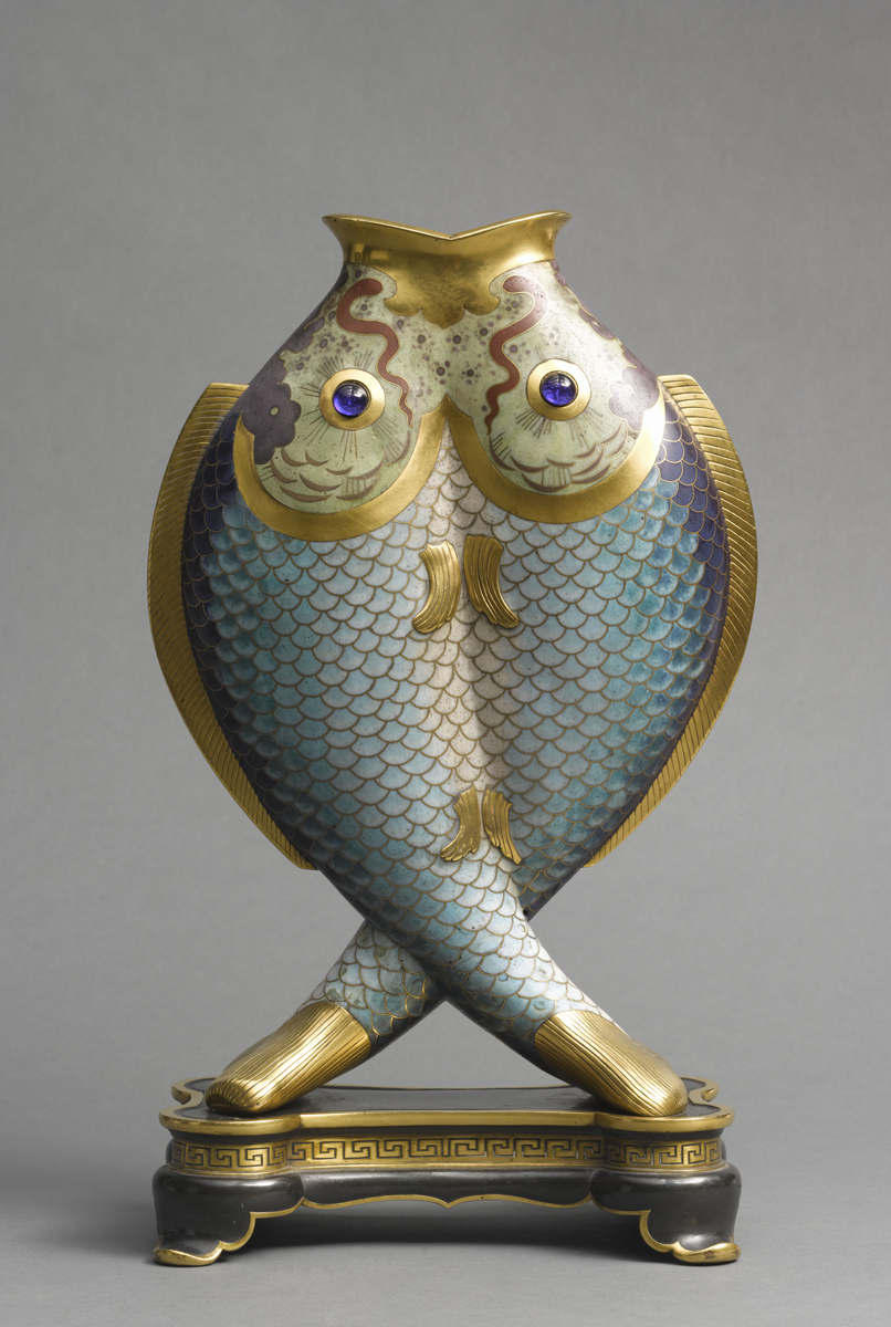 5- Émile Reiber (1826-1893) pour Christofle et Cie, Vase Deux Poissons, 1874. Alliage cuivreux doré, émail cloisonné, cabochons de verre coloré. H.39,5 cm ; L.23,4 cm ; P.14 cm. Musée d’Orsay, don Société des Amis du Musée d’Orsay (SAMO), 2019 © Musée d’Orsay, Dist. RMN-Grand Palais / Patrice Schmidt