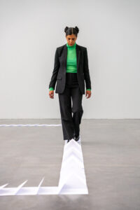 Non, je dirais plutôt que c’est une activation différente du corps. Dans mon travail, je tords les figures et elles ne sont jamais alignées. Je fais en sorte qu’elles ne tombent pas dans des pièges de sens, d’où une polysémie. Là, je ne pouvais pas me substituer à ce que dirait Esther Ferrer elle-même de son travail. En reprenant ses performances, on est un peu « à l’os » : les actions valent pour ce qu’elles sont et la surface de projection est vraiment l’imaginaire du public. Chacun peut faire le chemin qu’il/elle veut, et il n’y a aucune dramaturgie, aucun mouvement qui emmènerait le solo vers un climax et qui redescendrait après, pas d’interprétation théâtralisée non plus. Je dirais plutôt que ce sont des surfaces, un « blanc » théorique. C’est vraiment l’imaginaire du public qui va être au travail. Faire l’expérience de l’acte et se raconter quelque chose avec ça.