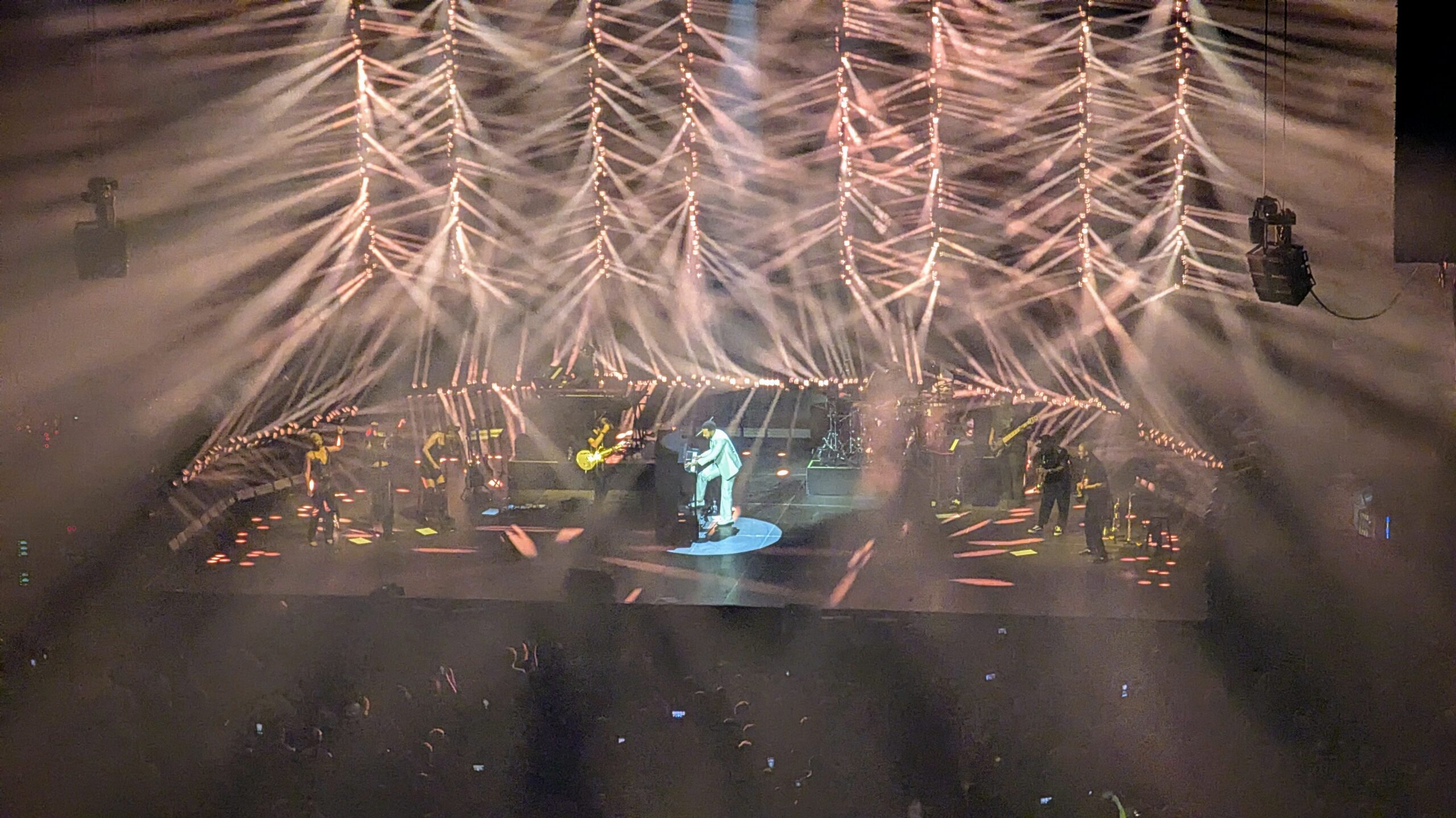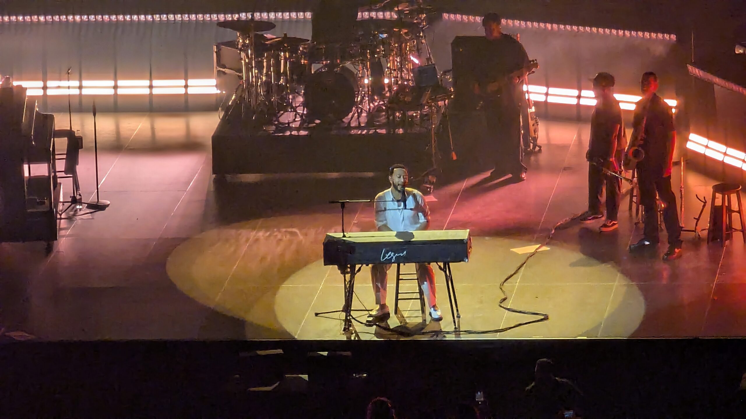 20h30, entrée de l’orchestre ! Pas de première partie. John Legend surgit sur une scène dépouillée, flanqué de six musiciens et trois choristes. Seul un light show anémique tente d’habiller l’ensemble.