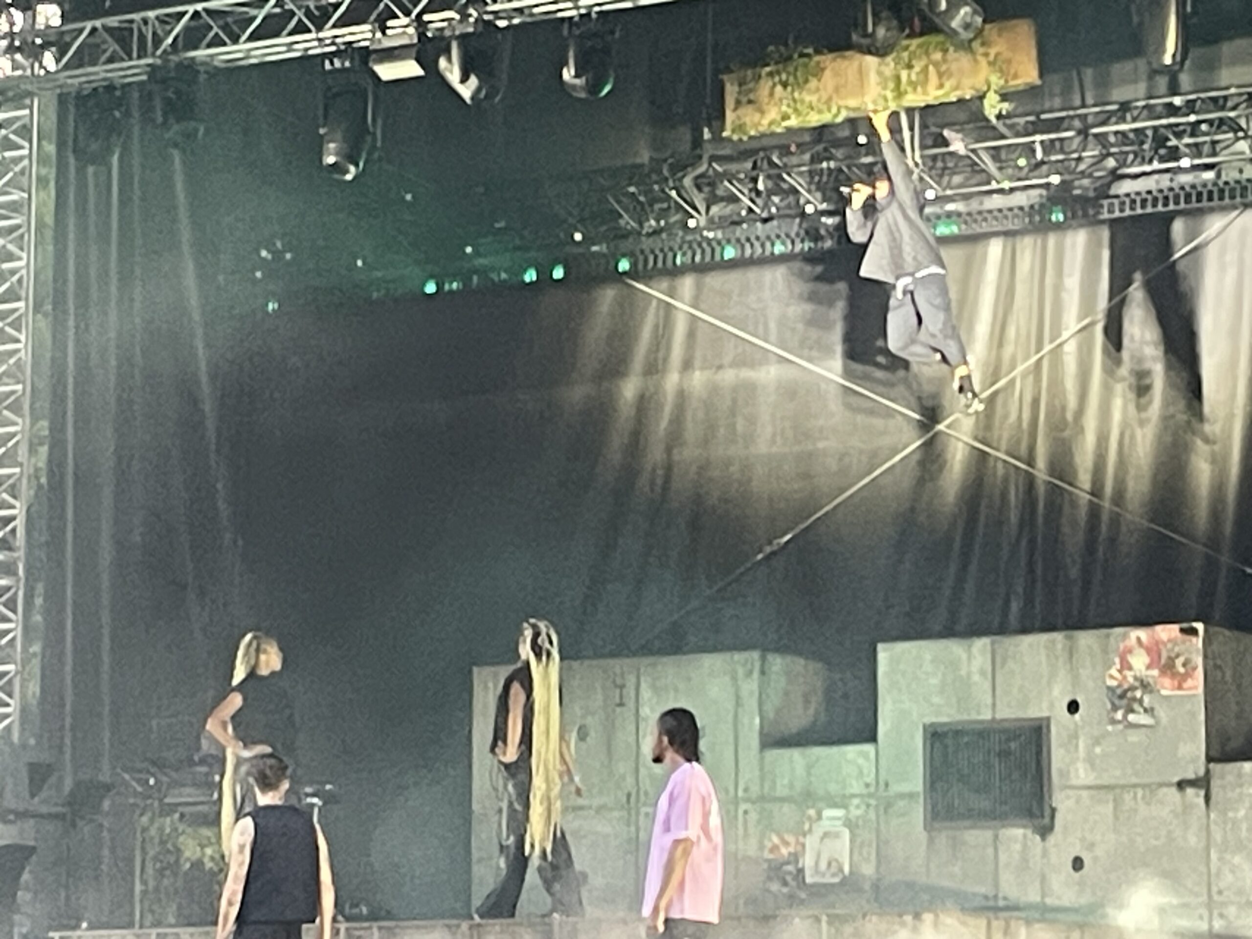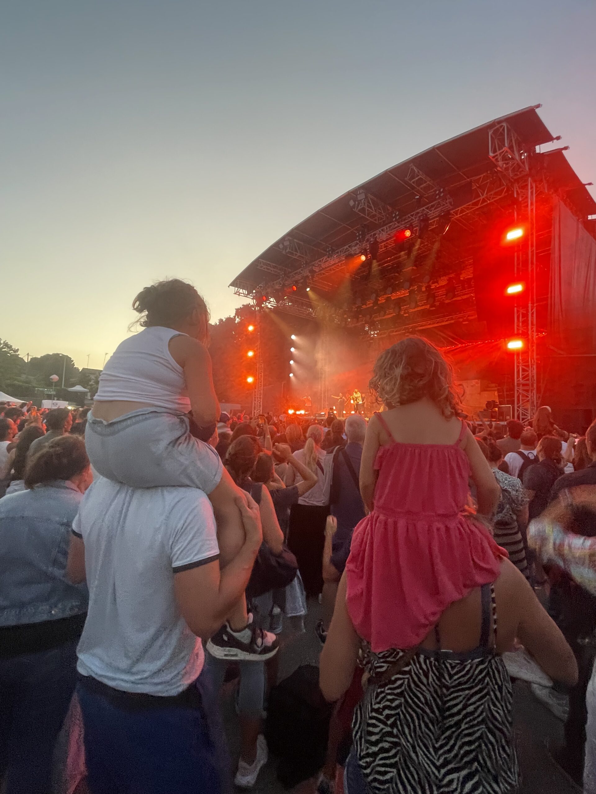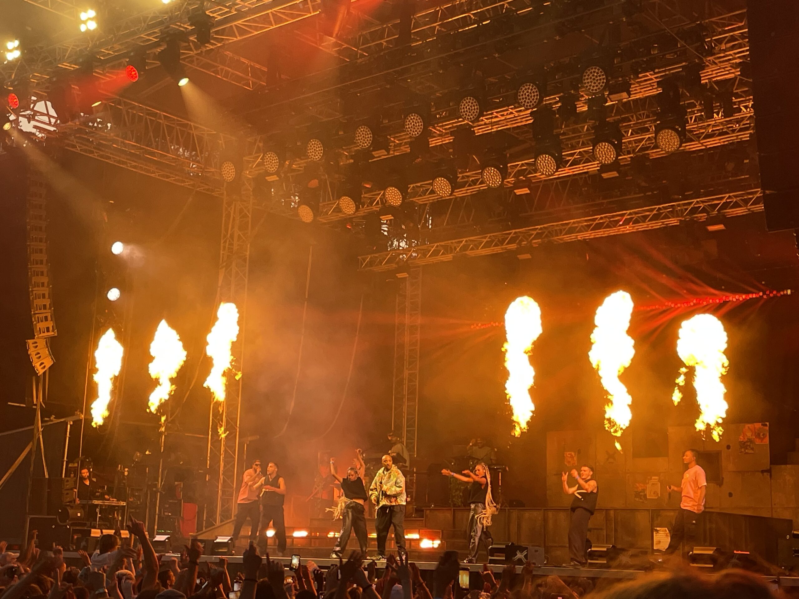 Ce sont à nouveau trois générations qui sont venues acclamer Soprano au vélodrome d’Arcachon. Après que DJ Bens ait chauffé la place, le chanteur, rappeur et ancien juré de The Voice s’est fait attendre quasiment une heure, agréablement passée à manger, boire, se retrouver et apprécier la scénographie du concert à venir avec de grands blocs de bétons qui amenaient un peu de street crédibilité près du sable. Et ce sont littéralement des flammes qui nous ont emportées dans ce « Freedom Tour » liée aux trois volumes du dernier album de Soprano (Liberté, Emancipation, Renaissance, 2024-25).