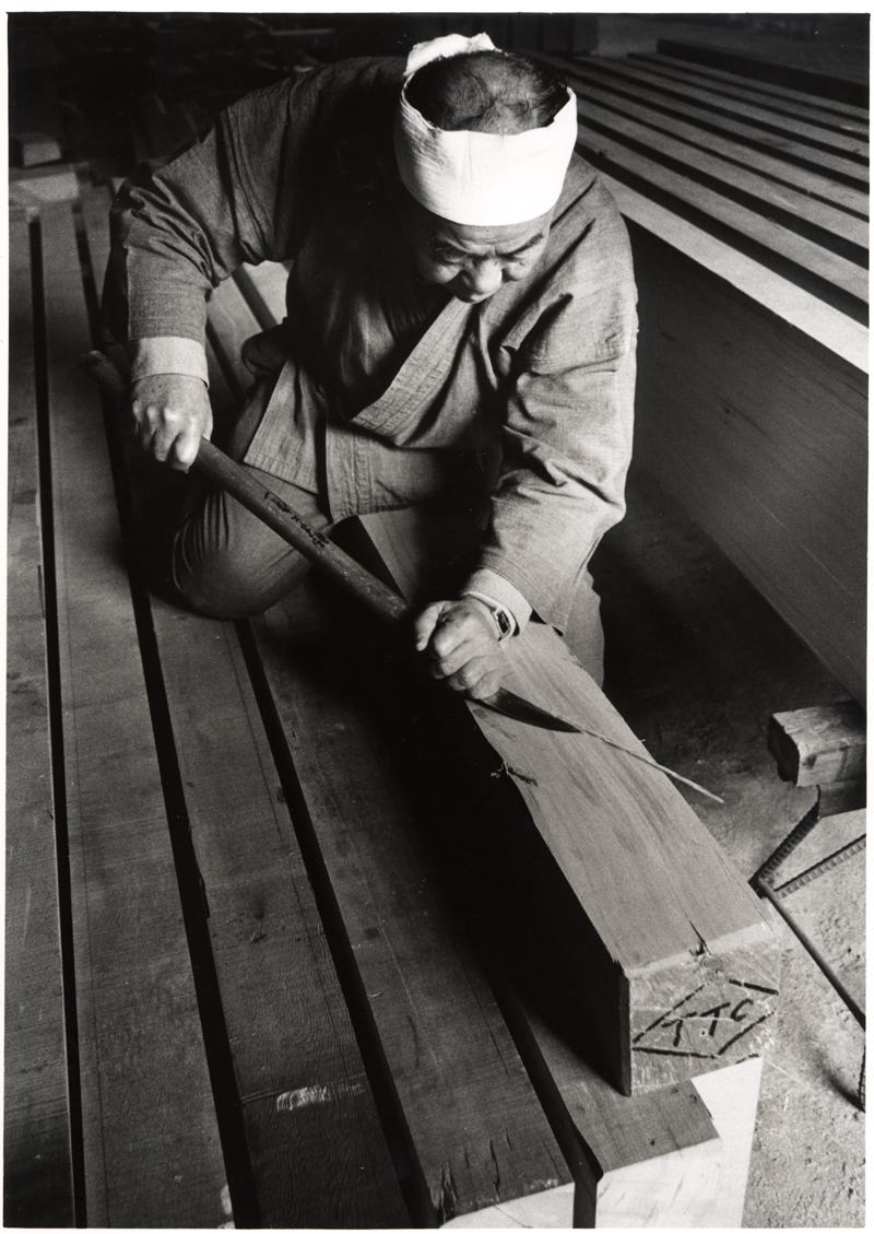 4- Le maître charpentier Tsunekazu Nishioka aplanissant une surface de bois avec un yari-ganna. © Takenaka Carpentry Tools Museum