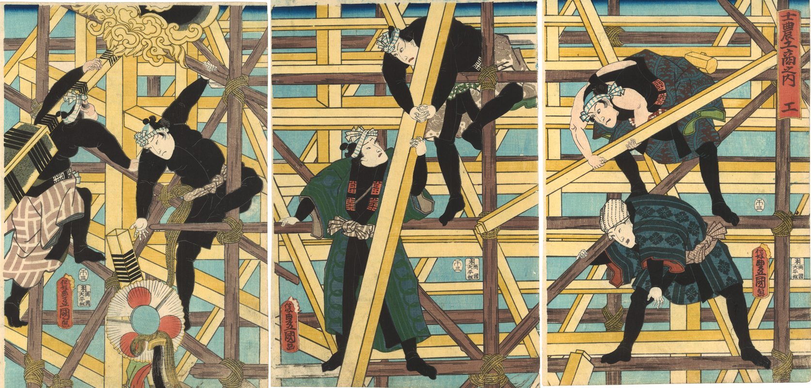 5- Les quatre classes sociales : les artisans Triptyque d’estampes nishiki-e / Utagawa Toyokuni III / 1858 © Takenaka Carpentry Tools Museum