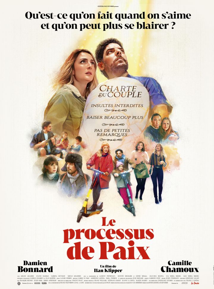 Marie et Simon (Camille Chamoux et Damien Bonnard) sont amoureux. Depuis longtemps. Ils sont aussi en guerre. Depuis longtemps aussi. Parents de deux petits enfants qui demandent beaucoup d’attention, ils ont des caractères… complémentaires. Lui enseigne le conflit au Moyen-Orient à l’Université, est plutôt introverti et reste très marqué par une famille décimée par la Shoah. Elle anime une émission de radio féministe avec une nana aussi culottée qu’elle (Jeanne Balibar, extravagante en cougar libérée), a une énergie débordante et emmène les petits au spectacle. Mais vivre dans des tonnes de couches ET mal se parler parce que chacun a des frustrations, ce n’est pas possible. Ils décident donc de signer une trêve et d’écrire ensemble (avec quelques verres) une charte de leur « processus de paix ».