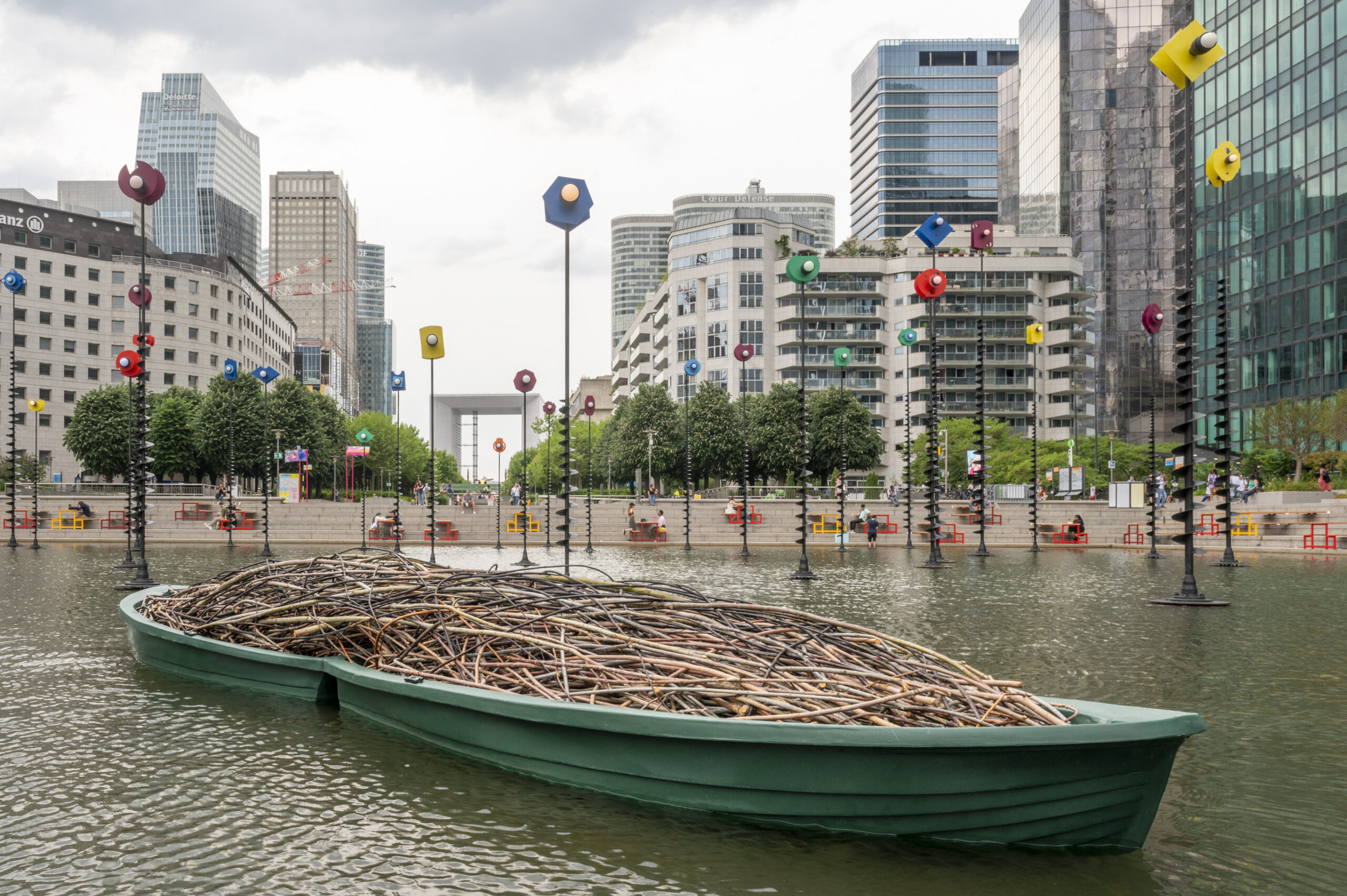 * L’eau, enfin est centrale pour la planète et pour l’homme, en témoignent les barques de l’artists Bob Vershueren installées dans le mythique Bassin de Takis à la Défense comme autant de rappels de notre vocation d’accueil. C’est aussi le très scientifique CorailArtefact CCA2 de Jérémy Gobbé, qui interroge la fonte de la barrière de corail au plus proche de l’ombre portée de la grande arche, dans une caverne qui fait penser à la survie.