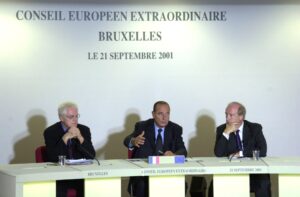 Lionel Jospin avec Jacques Chirac et Hubert Védrine lors d’un Conseil européen extraordinaire