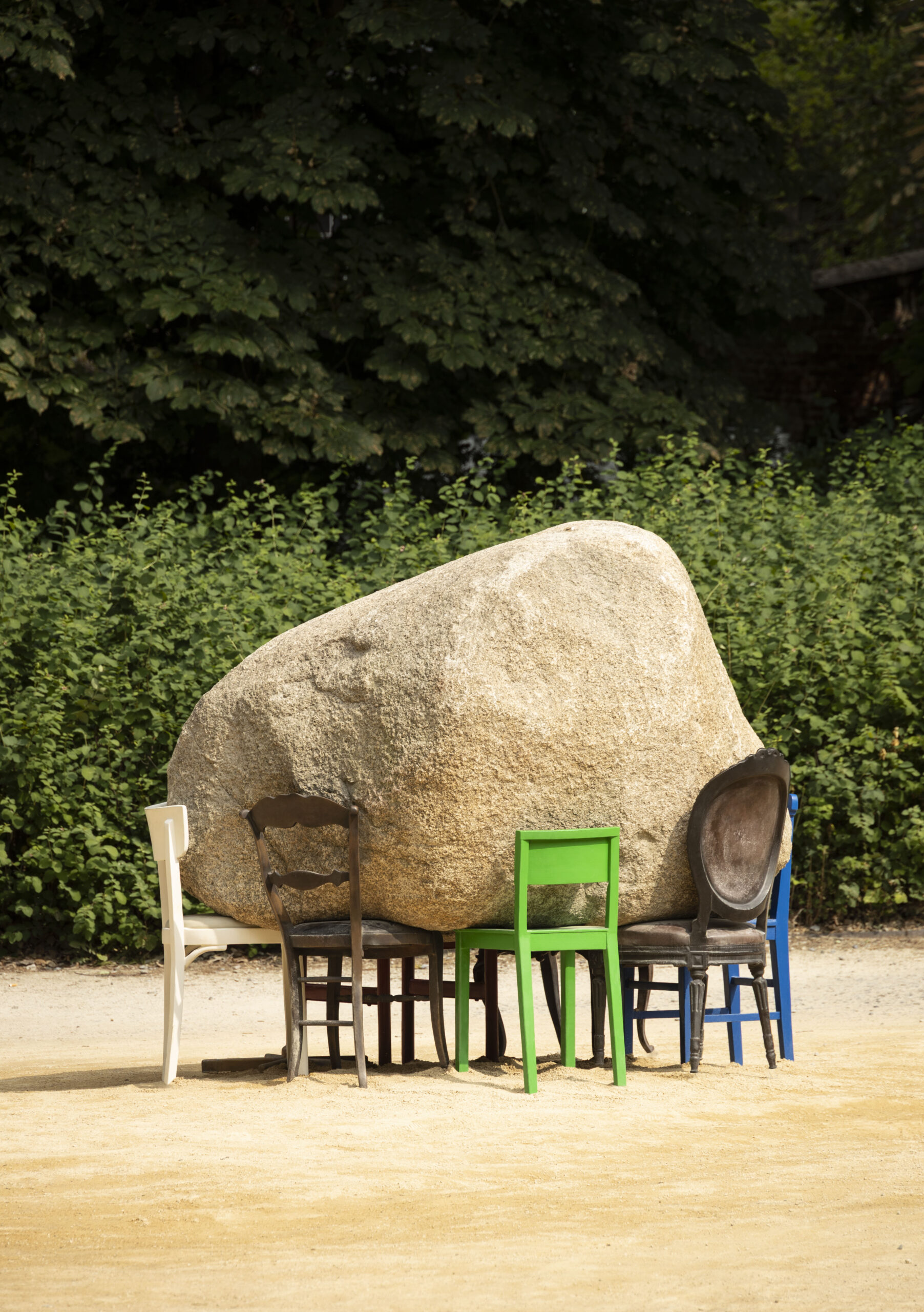 Dans un tout autre registre, Carriers d’Alicja Kwade manie l’humour au bénéfice du plus grand sérieux. Le poids de l’ignorance est un challenge collectif affirme avec éclat son installation. La plasticienne a posé un rocher monstrueux sur une collection disparate de chaises de bureau. Amusant mais surtout bien vu, un vrai remède à la tentation mégalomaniaque toujours possible. Et puis il y a la poésie. Une poésie forte qui surgit au bord d’un toit, d’un mur, en lueurs lumineuses et accompagne comme un viatique heureux en courant sur le tablier d’un pont. Le négatif lui-même se mue en vitalité. Comme le dit Maud Vanhauwaert dans son poème Euréka nous ne pouvons faire l’économie du doute parce que : « doubt is our motor « !