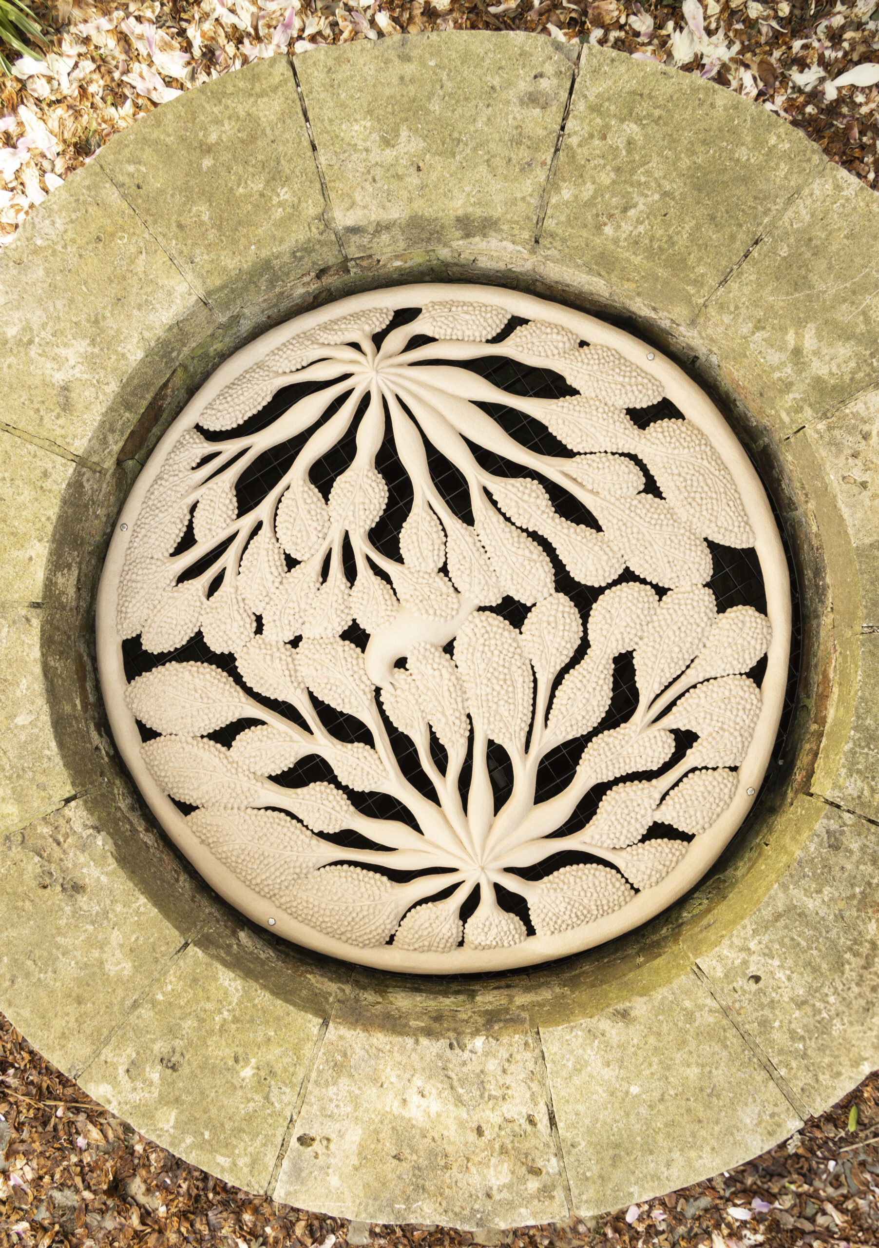 Parmi les œuvres qui ponctuent l’itinéraire certaines risquent de vous solliciter, attendrir d’autres vous amuseront. Clara Spilliaert a fermé d’opercules de bronze délicatement sculptés trois vieux puits qui attendaient endormis dans les ruelles sereines du Grand béguinage que quelqu’un s’intéresse à eux. Ces bas-reliefs évoquent la poitrine féminine faite de peau, de seins, de poumons, du réseau tissé par les veines… Spilliaert s’intéresse au traitement inadéquat dont les femmes pâtissent, le corps masculin étant toujours la norme pour tester les médicaments. La quiétude de son geste artistique et la volontaire discrétion de son intervention qu’il faut aller chercher en se penchant…au fond du puits ne laissent pas indifférent (Listen well, 2025).
