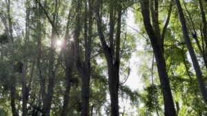 Juste à côté du parking : au lieu de traverser le pont, on s’aventure dans le sous-bois, une rangée de peupliers qui ressemble beaucoup à la toile de l’exposition intitulée Les Peupliers à Giverny. Ce ne sont pas les mêmes arbres qu’à l’époque de Monet, mais quand la lumière de fin de journée joue dans le feuillage des peupliers, c’est ce qu’on retrouve dans cette toile, prêtée par le Museum Barberini à Potsdam, en Allemagne. Un collectionneur qui a fait fortune dans le développement de logiciels a réuni une collection impressionniste extraordinaire, sans faute, et a généreusement décidé de mettre sa collection à disposition du public en la localisant à demeure dans le Museum Barberini. Il nous a été généreusement prêté.