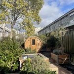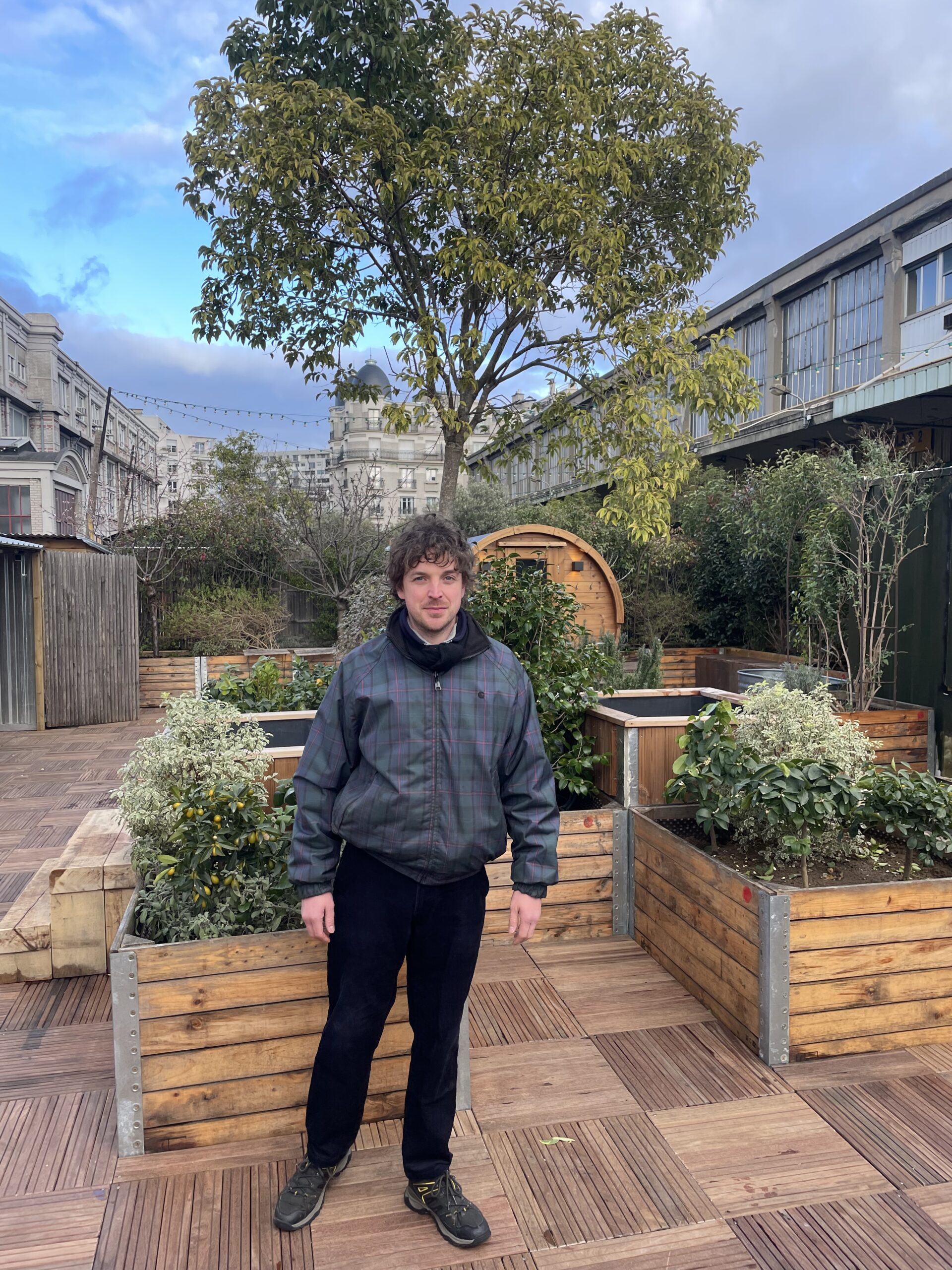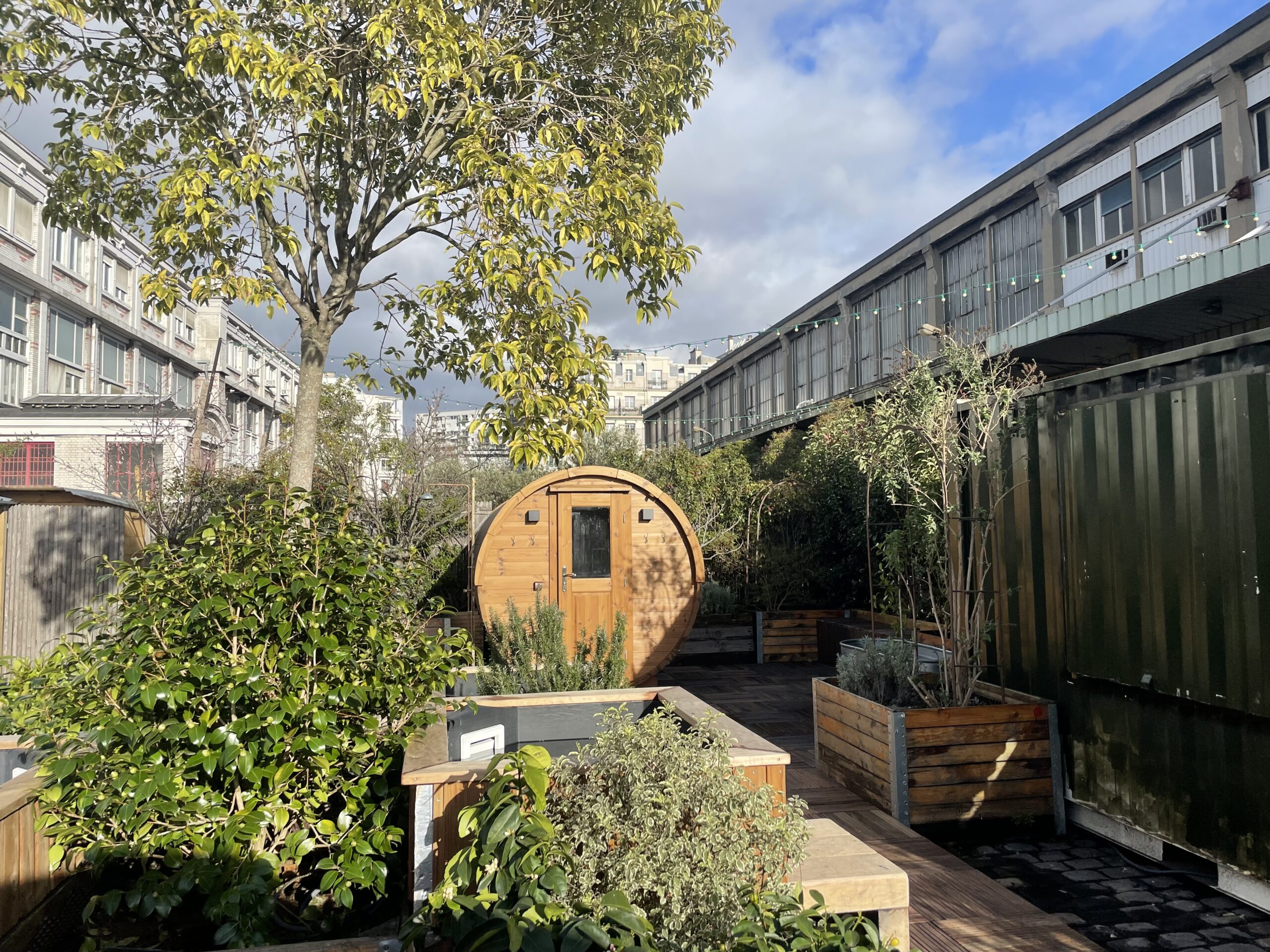 À l’arrière de la friche culturelle du 12e arrondissement, 100 m² ont été transformés en refuge nordique à ciel ouvert. Quand on y entre. cela sent bon le bois, avec des saunas venus d’Estonie, dont les grandes vitres sans tain donnent sur un paysage immense et l’horizon quasiment sauvage que permet la friche.