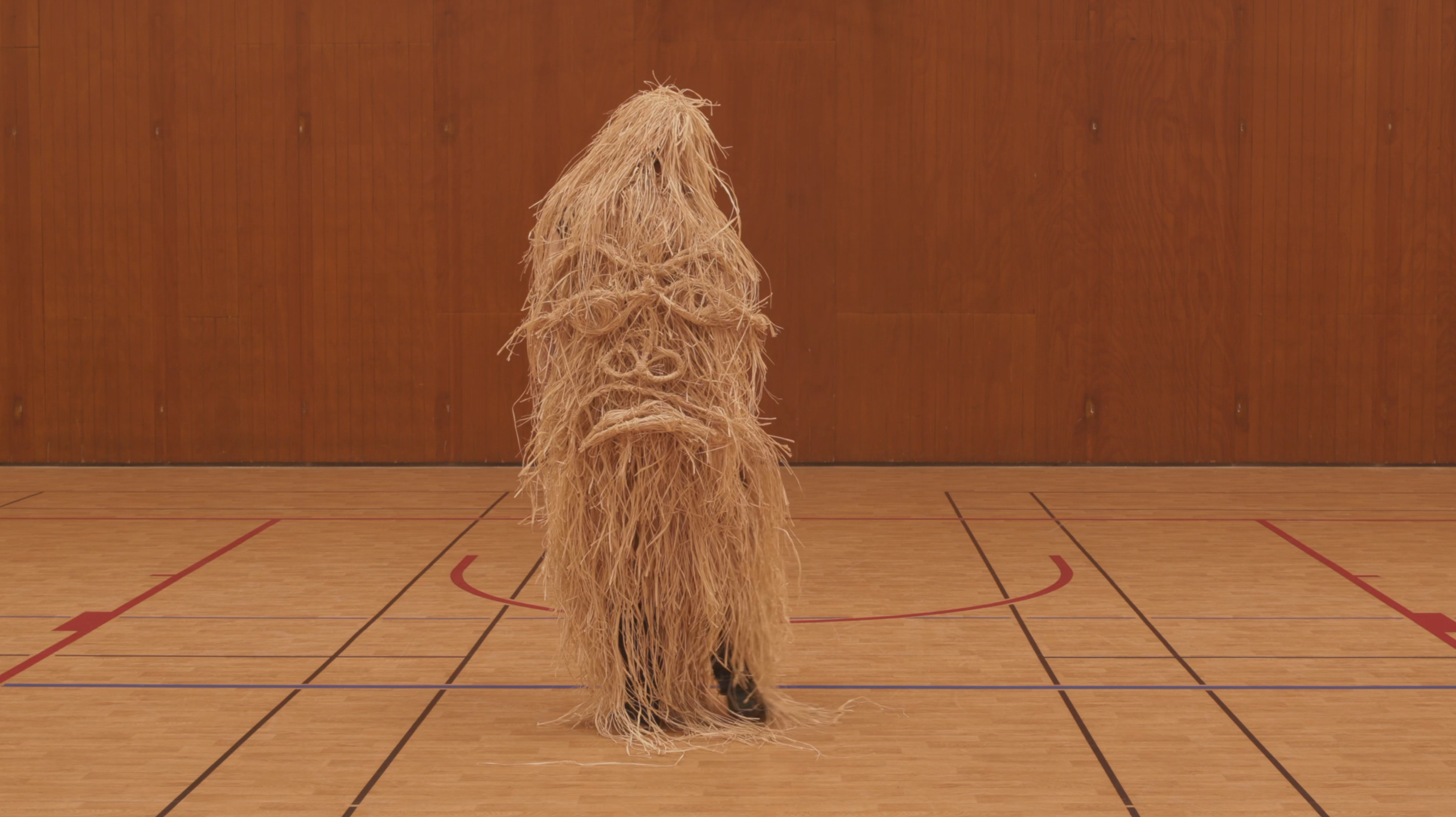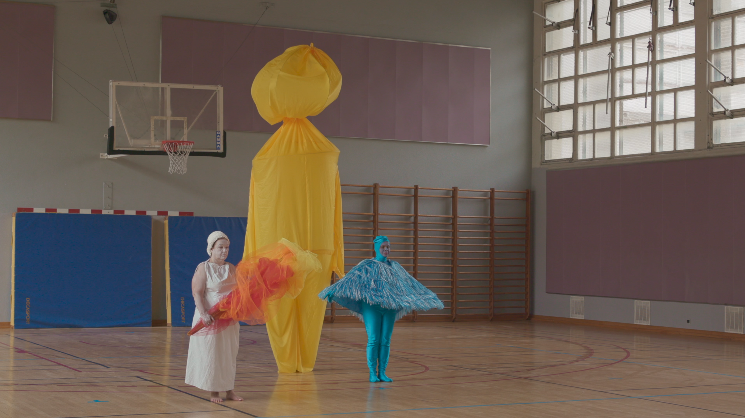 Ce sont deux projets qui partent de cette même idée de rejouer les cérémonies d’ouvertures de JO, mais dans deux contextes distincts et donc les deux films sont très différents. C’est assez intéressant ça de voir que ce n’est pas du tout la même chose selon où et avec qui je travaille. Le premier projet a été pensé comme une sorte de spectacle qui devient un film par la force des choses et, pour le deuxième, j’ai travaillé avec une quarantaine de personnes et je me disais que c’était à travers le film que, petit à petit, on faisait quelque chose ensemble. Je savais que le montage et le film me permettraient de produire cet effet, de faire une cérémonie ensemble. C’est un projet qui s’est fait de façon assez joyeuse, c’est-à-dire que, au début, on avait trois personnes qui venaient à l’atelier… Après, il y a les enfants qui ont vu les mascottes et c’était parti : ils commençaient à faire des petits défilés dans le centre social et après, du coup, plus de gens ont participé. C’était un peu une sorte de structure très vague, très vaste, et qui permet à chacun de trouver une petite place.
