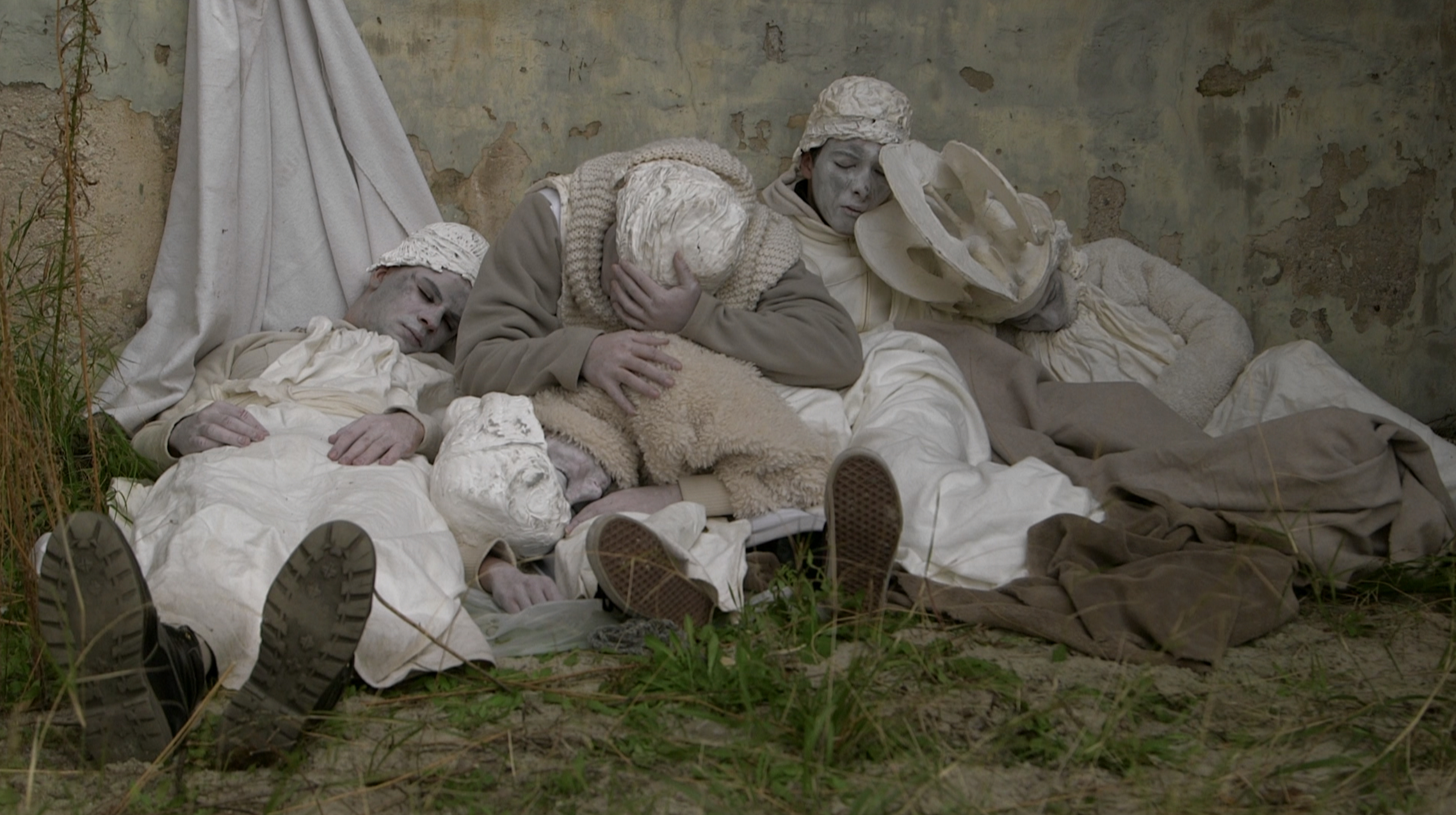 Quand j’ai fait Athéna Niké, au début, je pensais vraiment recréer la cérémonie et faire ce temps festif. Mais, en étant dans l’endroit, ce qui m’a semblé intéressant, c’était aussi d’essayer de vivre avec cet endroit. Les personnages de la cérémonie sont devenus un peu comme des sortes de fantômes qui hantaient ces espaces. Pendant le tournage, il y a eu un ouragan, il y a eu des inondations et, en fait, cet immense stade, où on est censé passer du temps ensemble, est intenable, parce qu’il y a trop de vent, il fait trop chaud, il fait trop froid. Quand il pleut, on ne sait pas où se mettre. Donc, j’ai vu mes costumes se casser, les couleurs ont délavé et petit à petit, ces costumes sont devenus des ruines, à l’image de ce stade, qui avait été joyeux un jour avant d’être cuit par le soleil. J’ai compris petit à petit que tout allait être décrépi comme le stade, jusqu’à l’attitude des personnages : ce n’était plus danser, mais juste essayer de se maintenir.