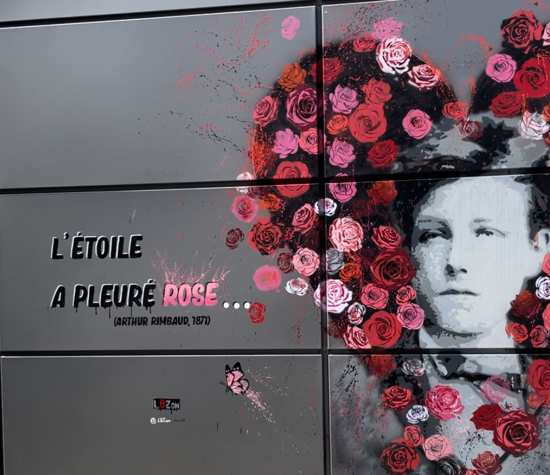 Présent avec beaucoup de mélancolie à divers emplacement qu’il remplit de roses, de poésie, de papillons et aussi de deuil, L8zon s’émeut de voir la végétation pousser devant sa représentation de l’amour impossible. Or, c’était fatal, à côté de son Rimbaud, s’est glissée une œuvre un peu pirate. Mais… elle est signée RNST ; Ouf ! C’est aussi un grand artiste ! Le premier graffeur amené sur place par le commissaire a été Speedy Graphito et, en 5 ans, beaucoup de grands noms se sont greffés : Arkane, Chanoir, Cezart, Smak3, Lady M, Braga Last 1 ou Akhnine… Et nous ne pourrons pas tous et toutes les citer. Il n’empêche que l’ensemble de ces photos des artistes auprès de leurs œuvres dresse un beau portrait de groupe de l’art urbain. Et qu’à entendre Gérard Lemarié et Antoine Frey, cette exposition marque un bref entracte avant que le street art ne continue à se déployer autour de la galaxie Frey… Une épopée à suivre donc.