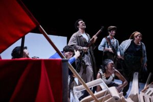 … et commence Pylade, de Pasolini! Au début de l’histoire, un Oreste changé rentre à Argos, sa ville natale, émerveillé par ce qu’il a vu à Athènes : son jugement a été rendu par une assemblée de citoyens, et non par un oracle hasardeux. Il refuse le trône qui lui est offert, et entend révolutionner la ville en instaurant la démocratie. Élu à la tête du parlement, il dirige la ville avec le Chœur, le peuple d’Argos. Commence alors une guerre fratricide : Oreste en costard, à la tête d’une société basée sur le profit et l’enrichissement, contraint de faire alliance avec sa sœur Electre, en uniforme fasciste, qui incarne les mouvements conservateurs, contre les armées populaires de Pylade. Car il faut savoir lire entre les lignes : ce n’est pas seulement l’histoire d’Argos qui est retracée, mais c’est toute la fresque de la première moitié du XXème siècle qui est balayée par Pasolini.