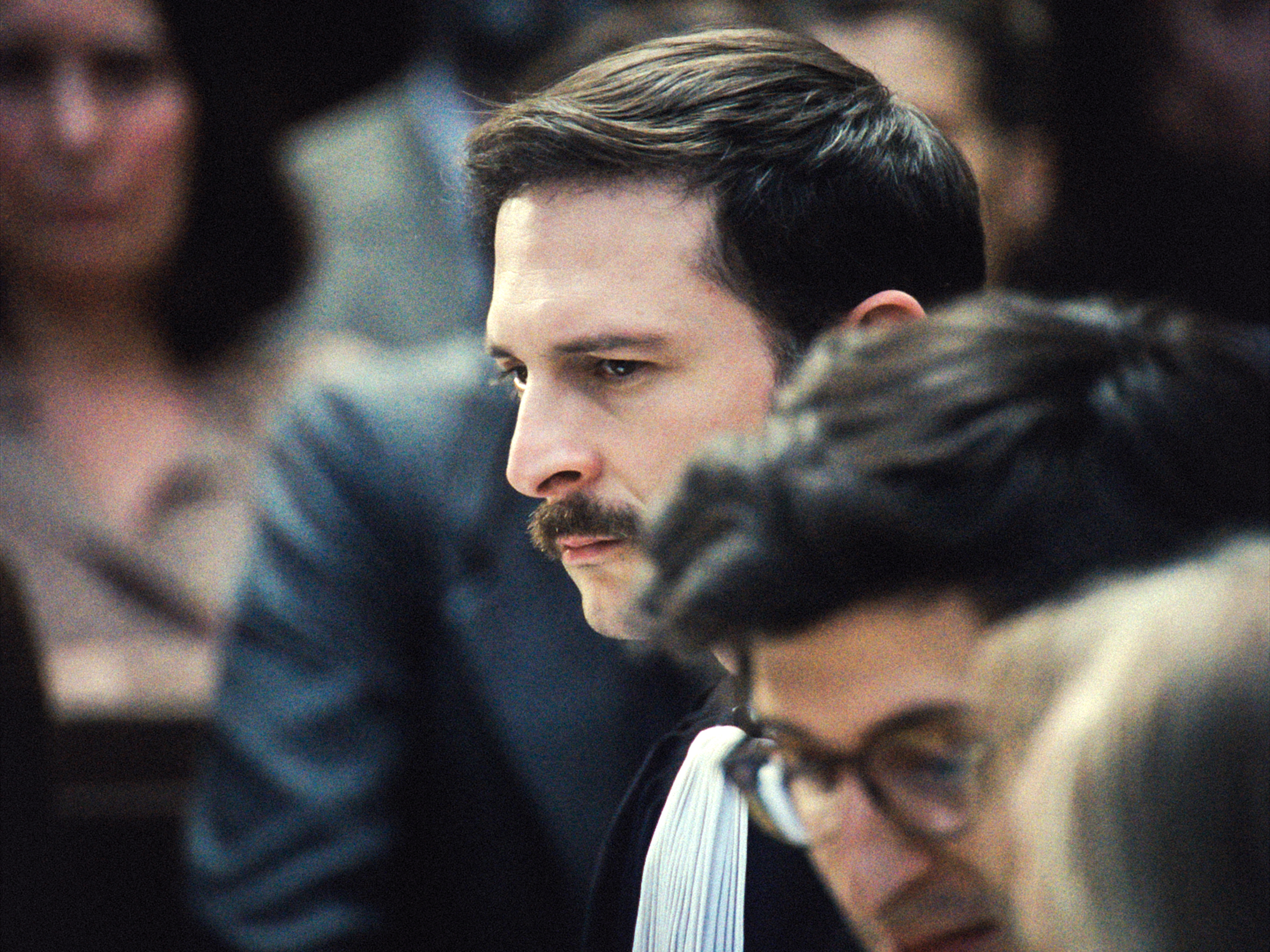 Dans le Procès de Pierre Goldman, tout est aussi droit et anguleux que le visage de Arieh Worthalter, qui incarne l’accusé. Sanglé dans un costume élégant, ce Juif d’origine polonaise, fils d’un grand résistant, veut que son innocence ne se démontre pas, mais constitue un état de fait. Et ce n’est pas le point de vue de l’accusé que Cédric Kahn décide de filmer, mais celui de la Défense, constituée de trois avocats, à qui Goldman ne facilite pas la tâche : Francis Chouraqui, Émile Bartoli et le principal, Georges Kiejman (incarné par Arthur Harari). Filmer du point de vue de la Défense permet de dépasser la question de la culpabilité, réelle ou fausse, de Goldman pour comprendre ce qui se joue quand ce procès et le personnage fascinent leur époque.