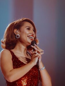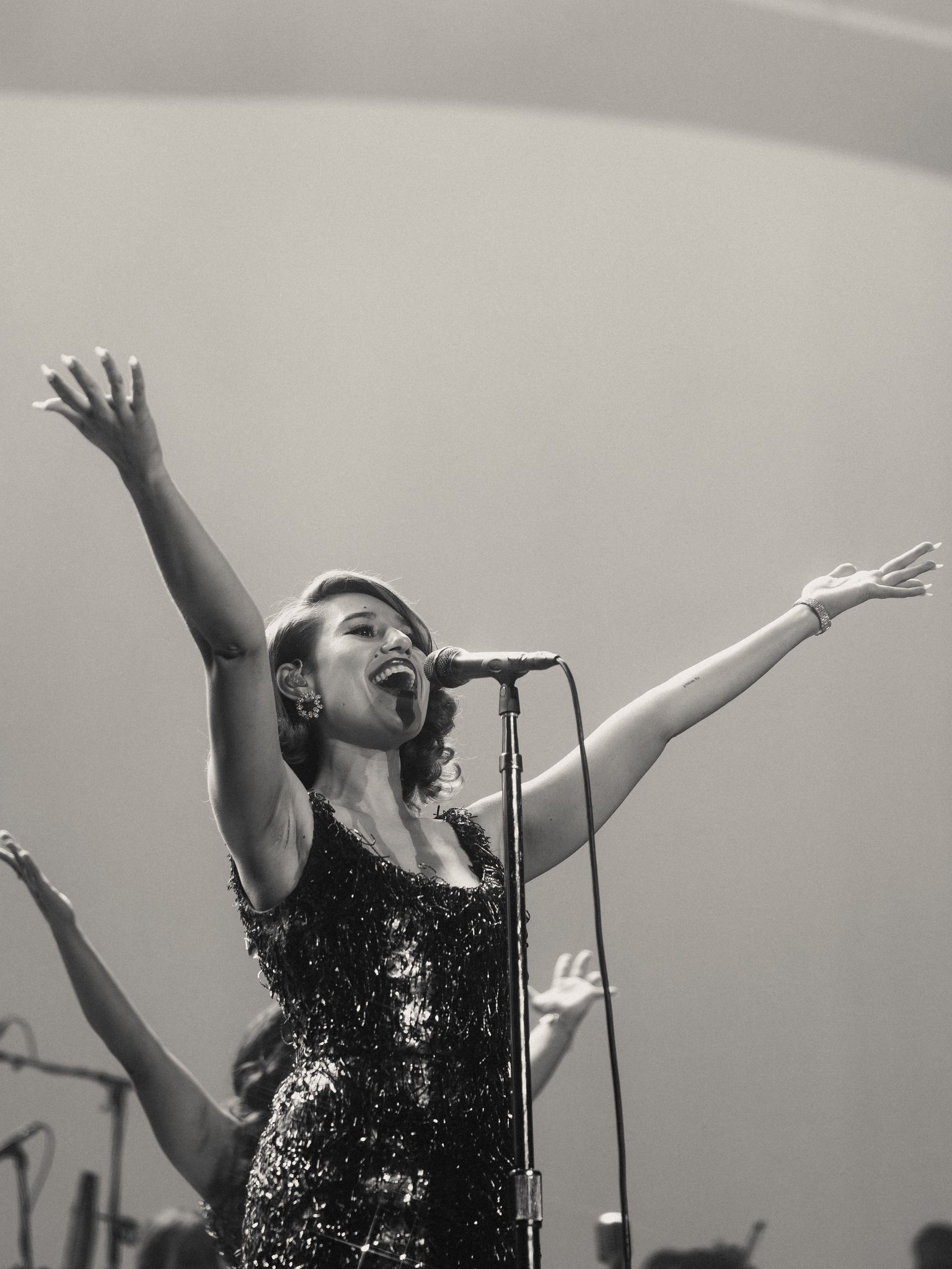 Après deux premières parties sympathiques de 30 minutes chacune, qui ont offert à ses deux sœurs un tremplin bienvenu, la scène se drape d’un rideau rouge digne des grandes scènes de Broadway. Un nuage gris descend des cintres, référence à la pochette du second album tant attendu, et elle se faufile entre les rideaux, sous les hurlements de la foule, pour interpréter « I Will Overcome », justement tiré de cet opus à venir, rejointe par la section de cordes. Malgré la nouveauté, le public exulte. Puis tout le monde s’éclipse, le rideau rouge s’ouvre et un orchestre de vingt musiciens surgit pour déclencher un « Where Is My Husband! » endiablé digne de Motown, où la voix de Raye explose littéralement. Ouvrir son show sur son plus grand succès mondial est un pari audacieux. Le résultat : une ovation de plusieurs minutes, sous laquelle l’émotion de l’artiste, clairement sincère, remonte à la surface.