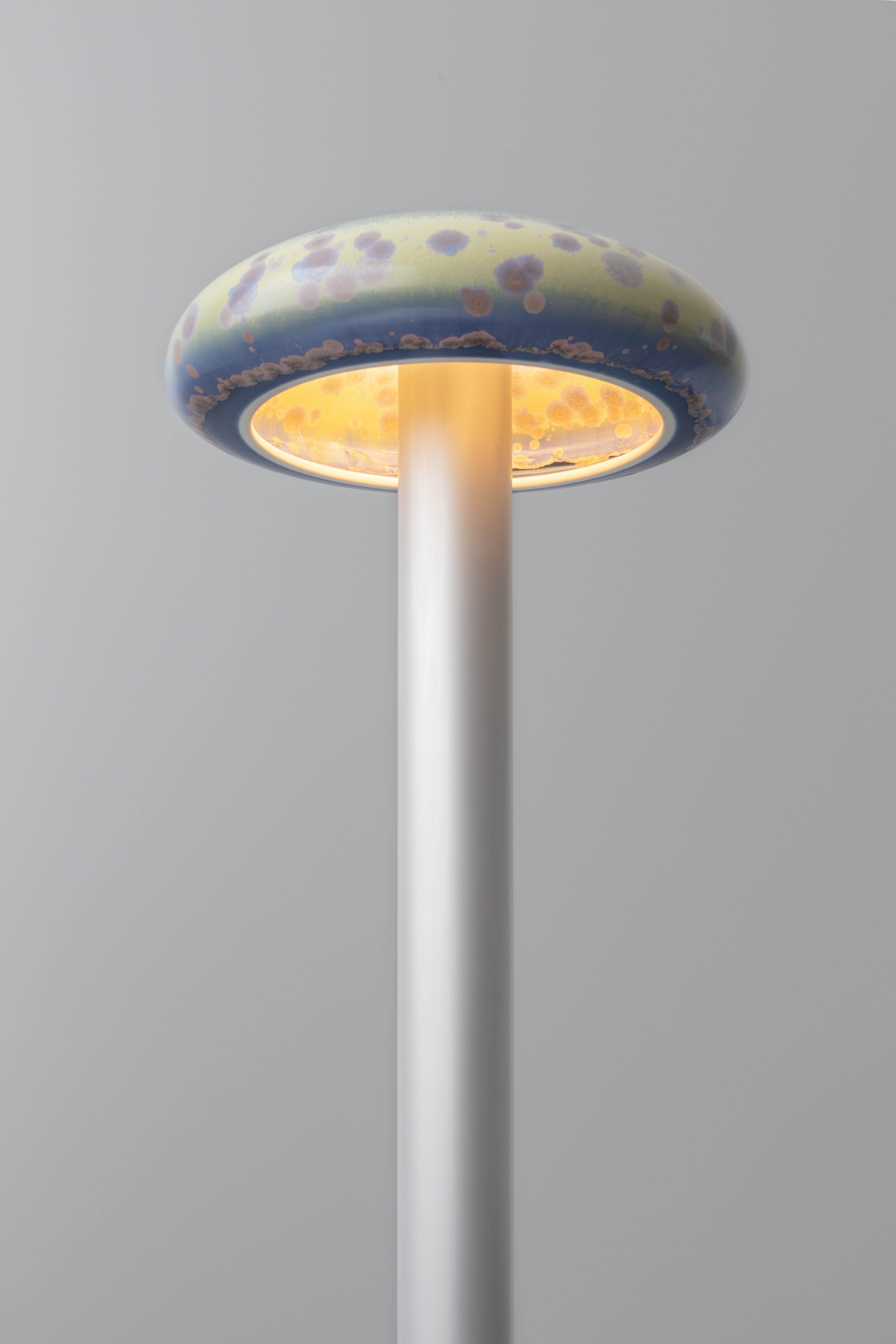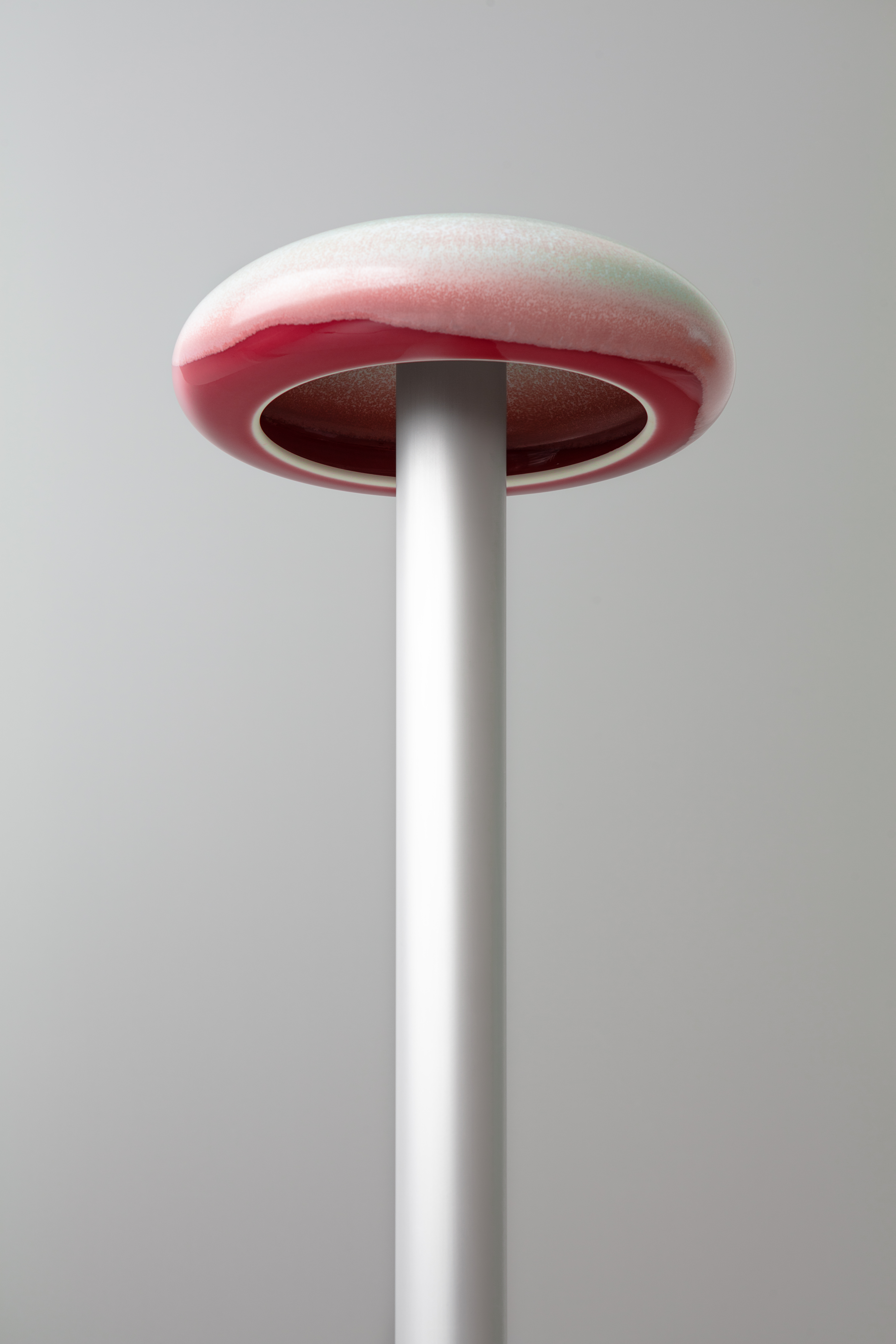 Quasi rien, vous dit-on, des points de couleurs variés, haut perchés, aux motifs aléatoires, semblerait-il, naturellement contingents. Le désir des visiteurs d’exposition n’est pas habitué à se canaliser pour se focaliser sur le détail. Ici, le détail c’est un petit chapeau de céramique, invoquant toutes les réminiscences de la céramique de l’art nouveau, notamment les travaux d’Émile Gallet (même si c’est un verrier), ou les couleurs de la céramique Art Nouveau de Saint-Amand, flottant sur un pied bien concret, un pied de designer industriel, en aluminium anodisé, qui reflète la lumière de manière étonnamment artificielle, un camaïeu de gris comme une image de synthèse.