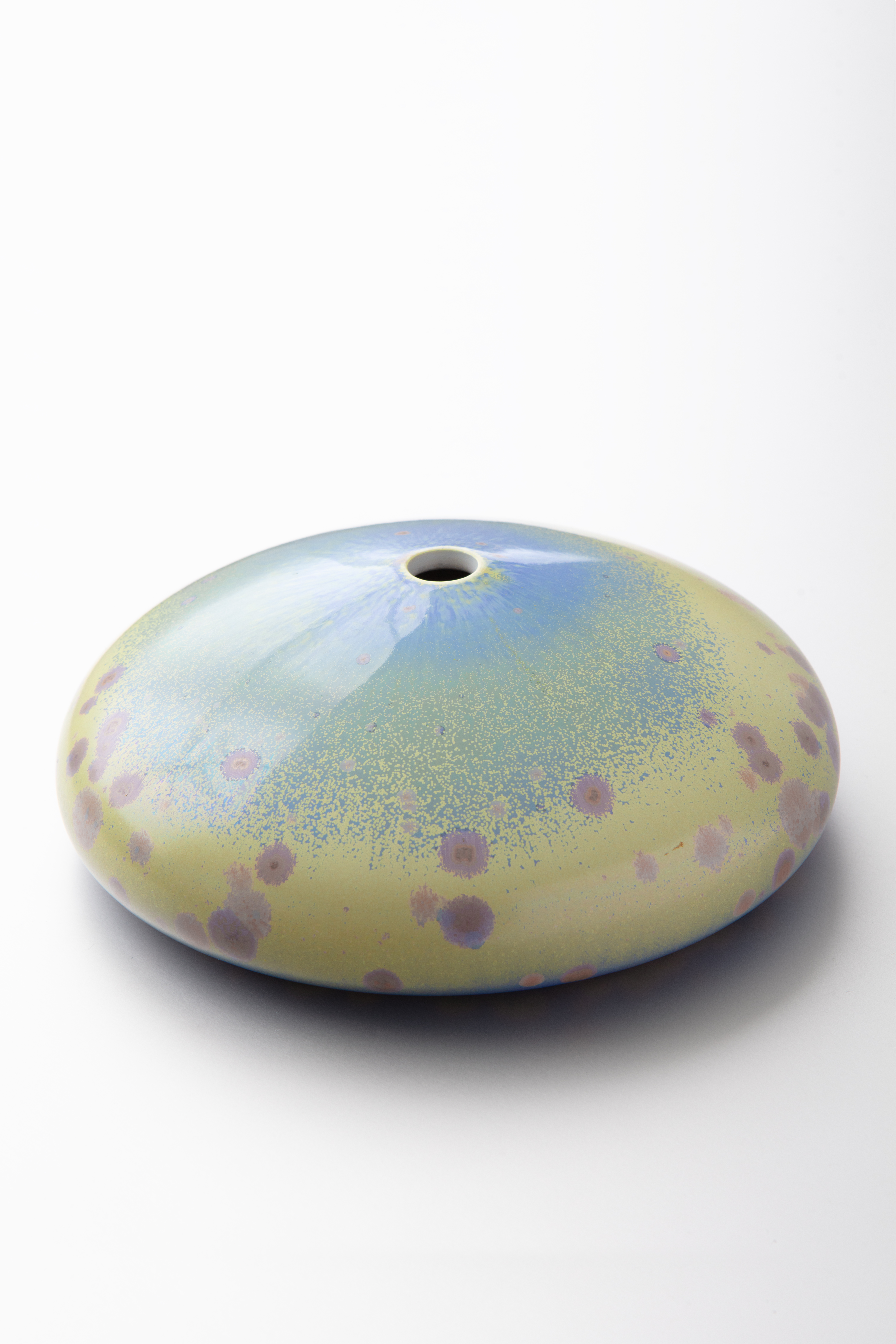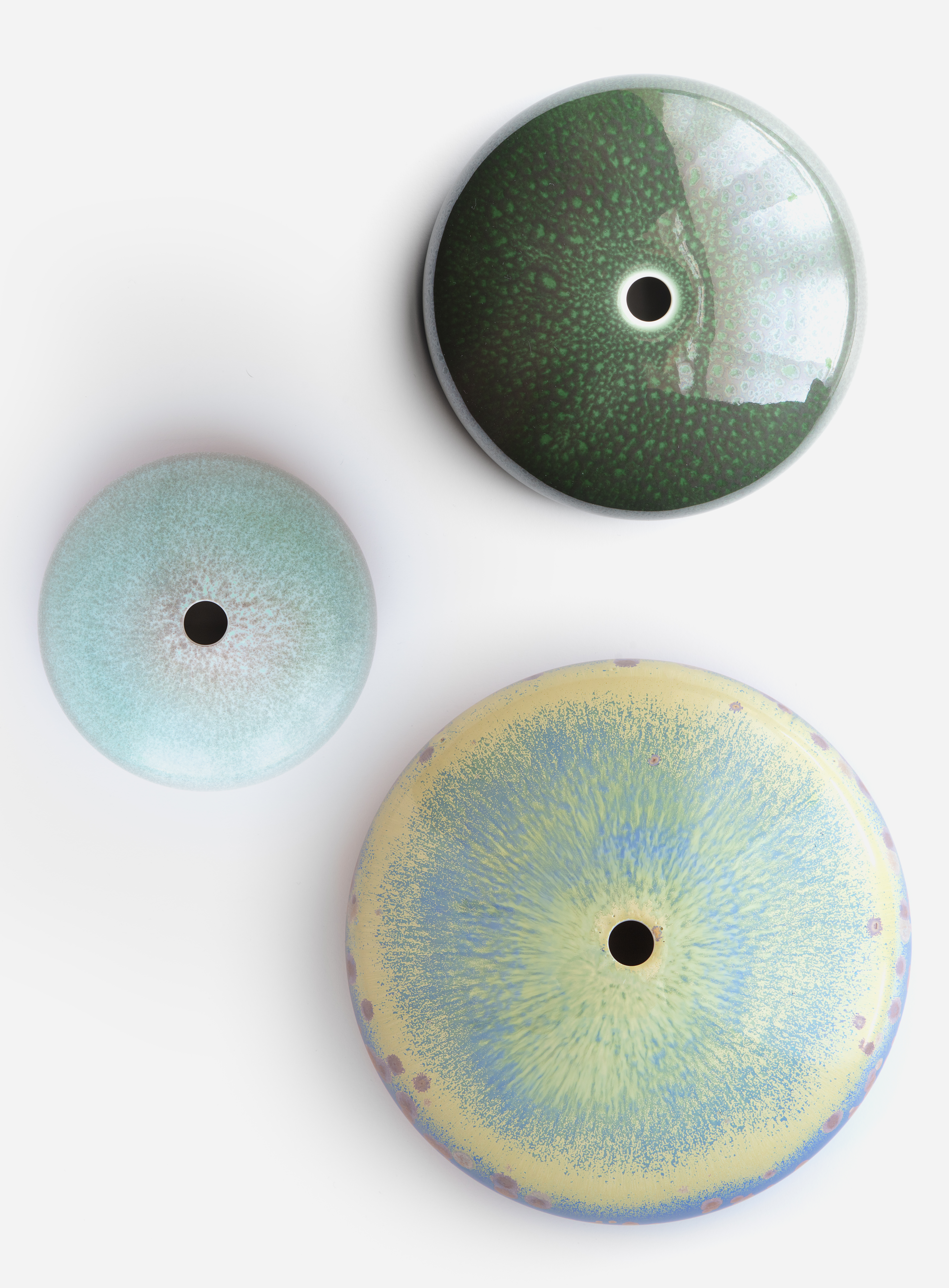 La corolle, elle, a toujours la même forme et la même taille. C’est un petit miracle, le lieu de l’accident. Un accident tout relatif car il aura fallu trois ans de tests, beaucoup de pièces ratées, et la sélection rigoureuse d’un obsédé de la couleur pour arriver à ces striages concentriques d’iris, ces coulures ou ces explosions d’oxydes variés, ces motifs qui allient le magique et le maîtrisé, mais dont l’effet est d’ajouter pour l’œil une dimension naturelle à l’œuvre, enfin à la lampe, car il s’agit de lampes. La taille des corolles a été dictée à RB par la taille des tours et des dimensions de confort pour l’artisan : quelle est la taille optimale pour travailler de manière confortable ? Il y a trois types de couleurs d’émaux : les vertes, les bleues et les plus claires. Mais chacune est unique : les différences apparaissent dans la hauteur du rosé, la présence ou pas de dépôts, l’explosion ou pas des oxydes, c’est ce que l’on appelle la cristallisation ou de manière quasi mystico-alchimique, la nucléation.