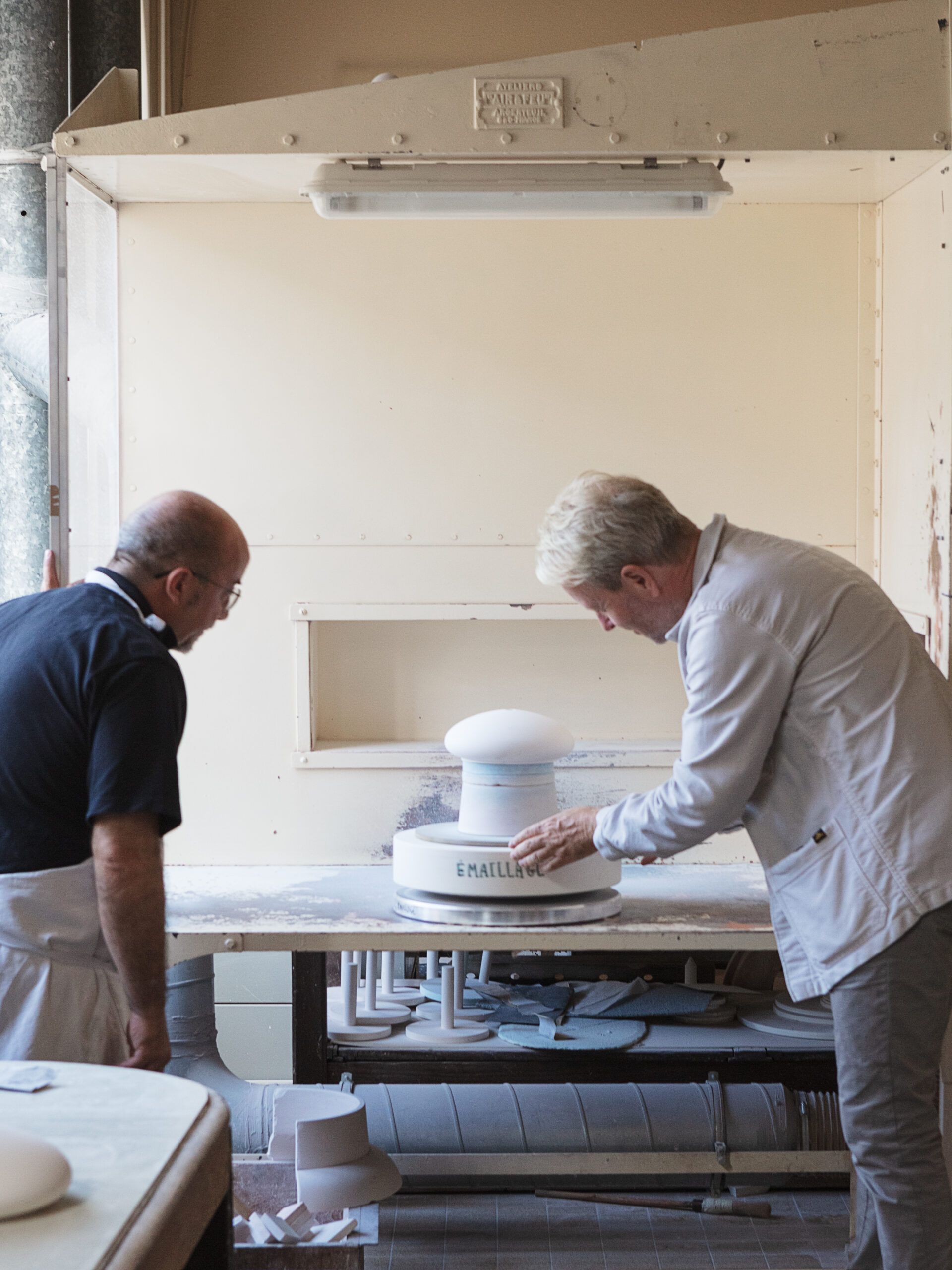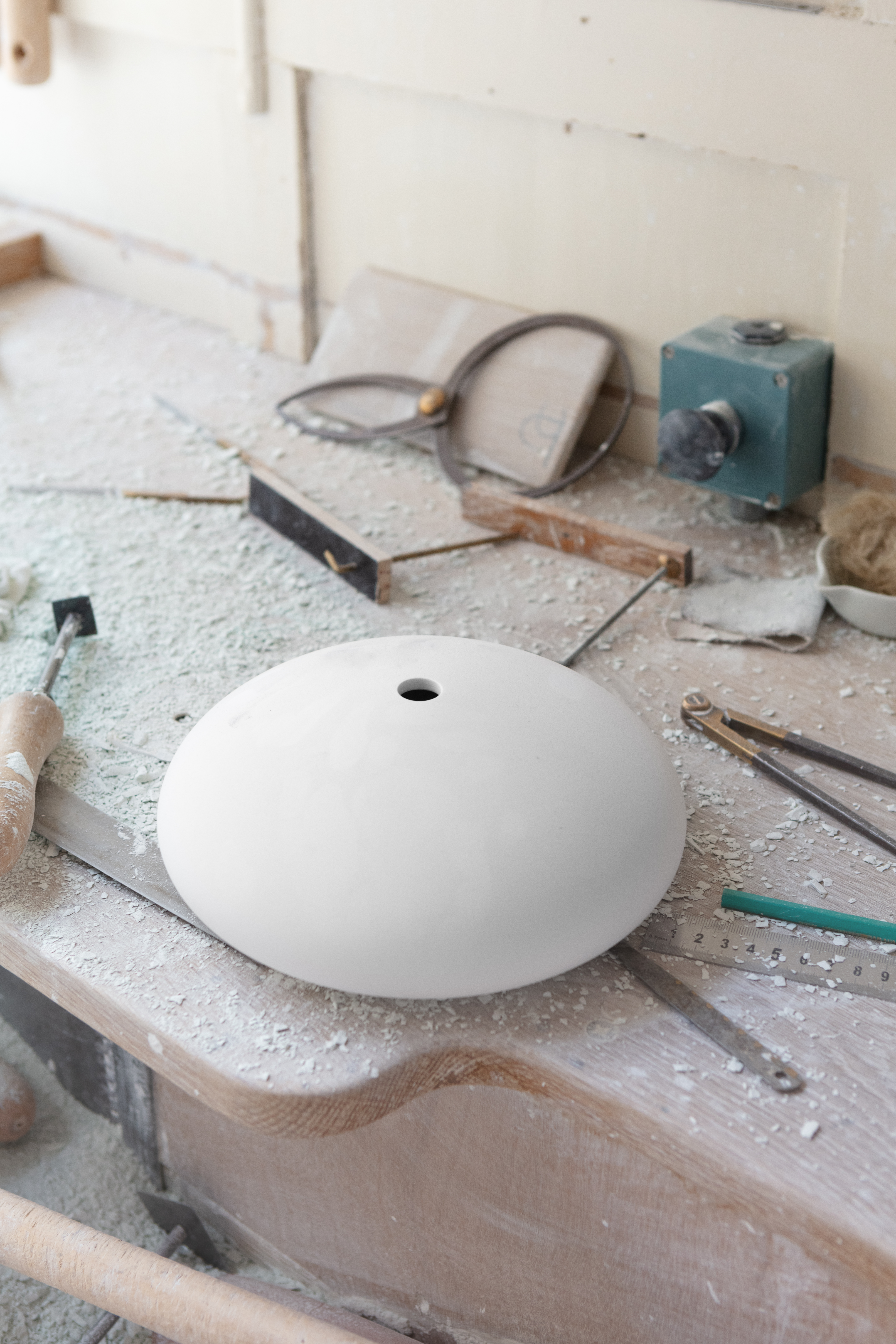 Détail bijou car Ronan Bouroullec est très attentif à ce genre de choses : le pied s’arrondit avant de rejoindre sa base, et le léger biseau de cette même base donne une sensation de flottement. Tout ce qui se passe sous la céramique est et doit rester irréel. Il y a trois types de pieds de différentes hauteurs. Il y a 30 modèles en tout dans l’exposition : 10 par taille.