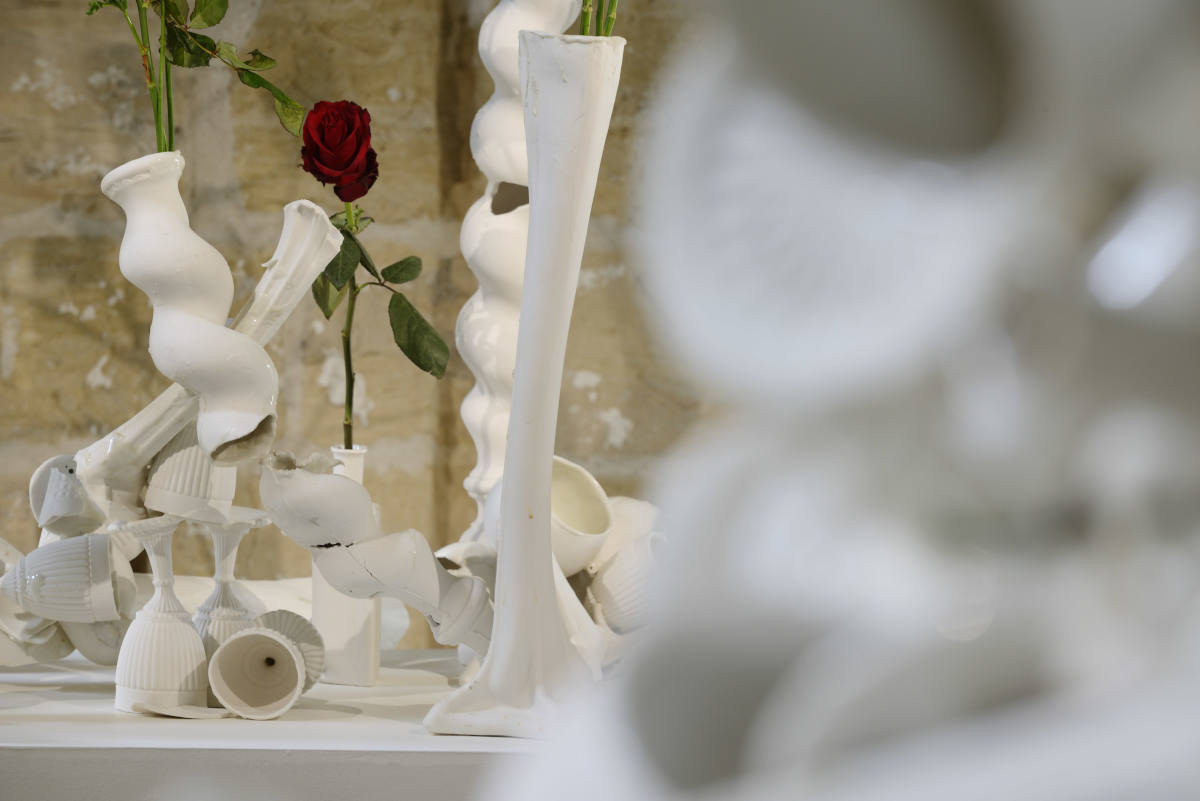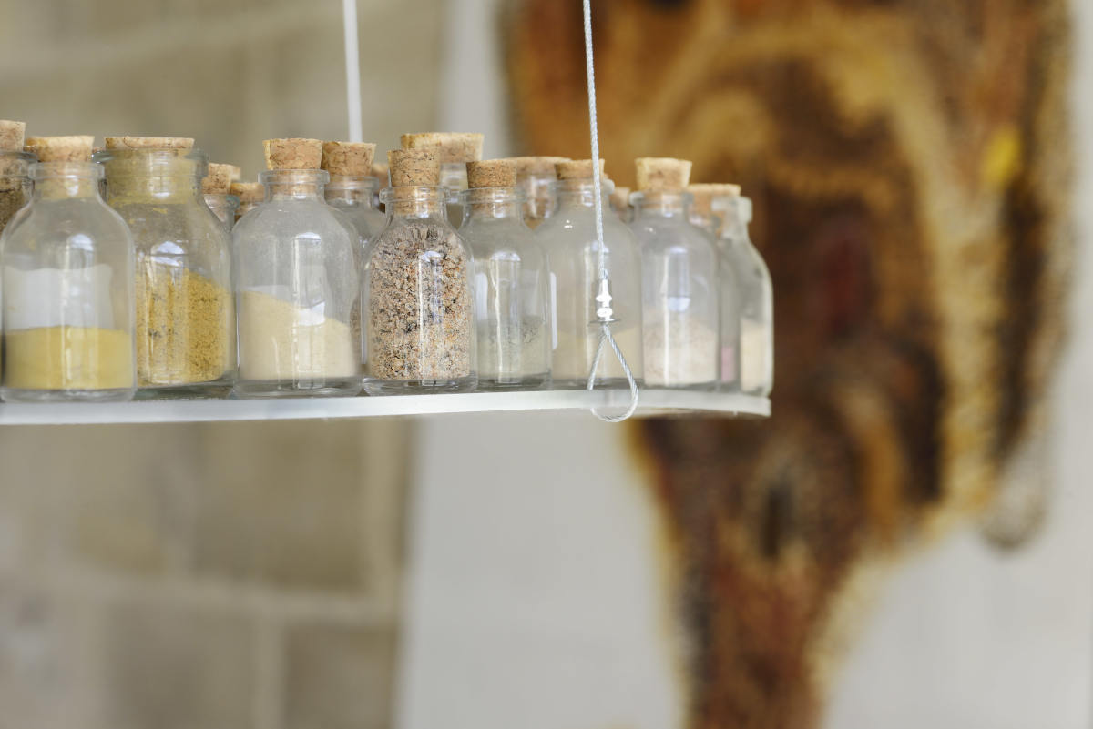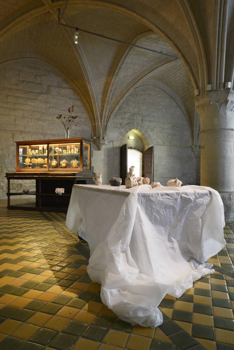 Parmi ces œuvres, notons celle du parfumeur Daniel Pescio qui a imaginé raconter le passage du temps avec un nouvel encens à diffuser à l’entrée de l’exposition chaque semaine, laissant les odeurs imprégner les pierres et orienter la visite. Dans les vitrines d’un cabinet de curiosités, les bocaux de plantes prêtés par le musée de la pharmacie François Tillequin nous rappellent la place essentielle du végétal tant dans notre univers sensoriel, que dans la création de couleurs, de parfums, ou encore de pharmacopées. En lien avec le domaine de l’Abbaye, l’œuvre Terra.Spiritus de Daniela Busarello, située dans le passage qui relie les deux jardins, diffusant une odeur de térébenthine, dresse un portrait du parc en transformant les matériaux prélevés en pigments pour créer une peinture pointilliste.