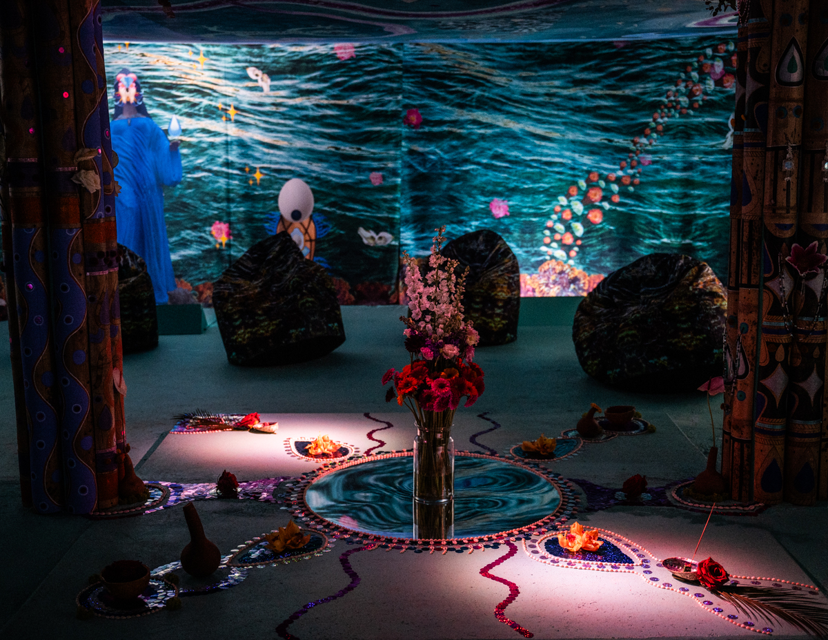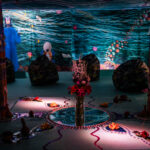 La surprise est totale avec la caverne aménagée par l’artiste kanak, Shivay la Multiple, en l’honneur de la déesse Yemayá. Une invitation cosy et ambrée, digne de l’île de Circé, où coquillages et couleurs nous permettent doucement de remonter à la surface, dans un poudroiement irisé. Il n’empêche, en poussant la porte qui nous ramène au dehors, la lumière fait l’effet d’une claque. Nous aurons peut-être autant appris sur nous-mêmes que sur les fonds marins, dans cette expérience immersive qui nous invite à découvrir « une autre façon de luire et de trembler », pour reprendre les mots de Mariette Navarro.