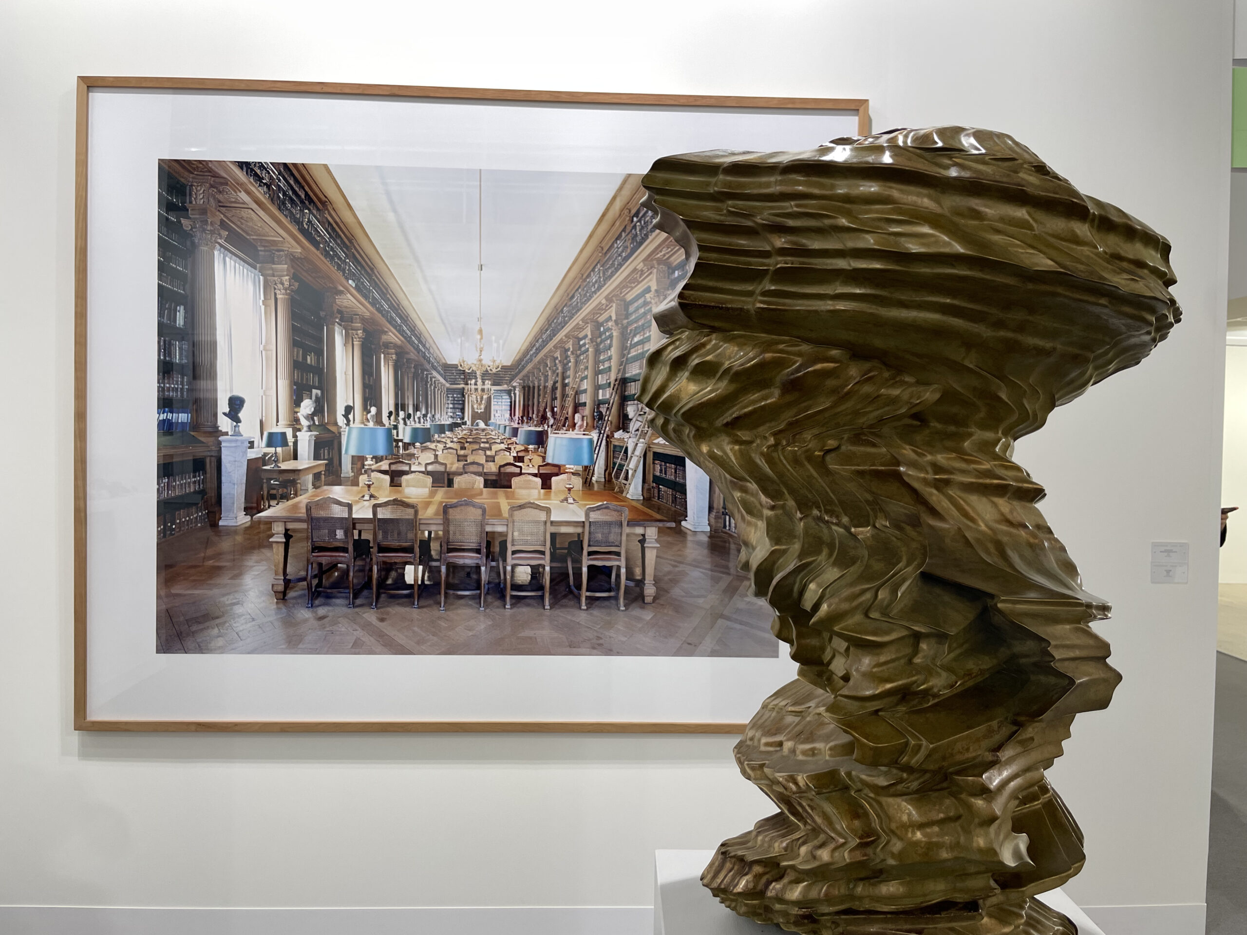 Comme d’habitude, le rez-de-chaussée de la foire est dédié aux plus reconnues des galeries et à des œuvres qui pourraient être dans des collections de musées, tandis qu’à l’étage, qui est tout aussi foisonnant, aussi bien Chantal Crousel qu’Emmanuel Perrotin côtoient des galeries encore plus internationales. Ainsi, on se délecte de Picasso et l’on se pâme devant des dessins de Picabia chez Michael Werner, des Léger en comité d’accueil chez Landau, des extraordinaires De Chirico chez Tornabuoni, des Basquiat chez Van de Weghe, des David Hockney chez Offer Waterman mais aussi des photos de Lee Friedlander chez Luhring Augustine. Un bon résumé de la foire tient dans une sculpture de Tony Cragg devant une bibliothèque de Candida Höfer.
