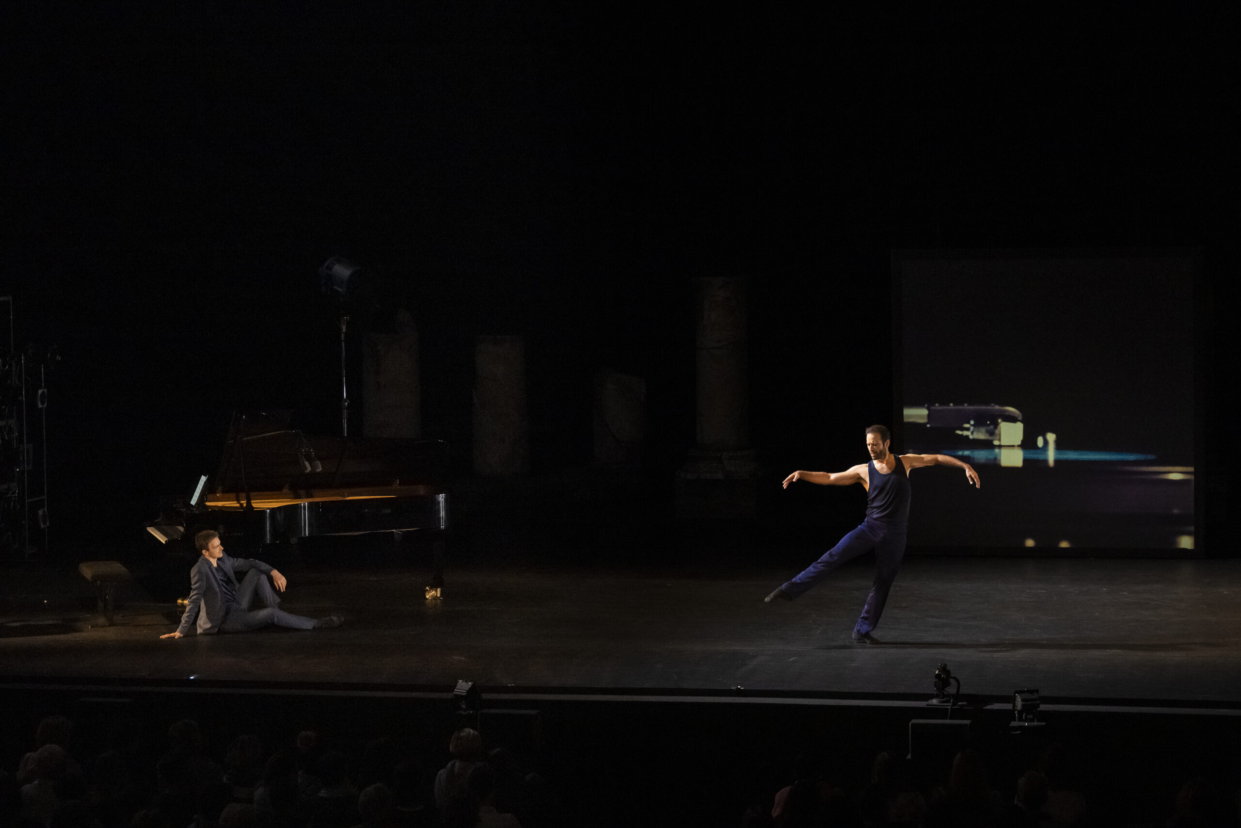 Peut-être plus encore que la physicalité de la dernière séquence, où les deux artistes revisitent la 32e sonate de Beethoven comme un séisme : Millepied grimpe littéralement d’une traite les marches du Théâtre Antique, tandis que Tharaud met à exécution la renaissance du compositeur de 50 ans. La lumière éclaire les 2500 spectateurs qui ont été plongés dans l’intimité de la création au fil du temps. Et qui applaudissent debout les deux artistes. Un bis est donné, à la fois espiègle et raccord avec le temps menaçant de Lyon : « Pierre/ Il pleut ».