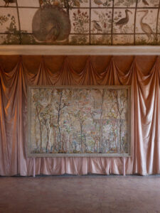 Nous poursuivons vers la chambre aux oiseaux, où l’on tombe d’inanition devant les immenses broderies exposées sur des tentures de soie rose, sous le regard bienveillant des paysages et des oiseaux qui ornent les plafonds. Cela rappelle qu’Eva Jospin multiplie les matériaux. Son Bosquet, suite Tromper l’œil (2024) est une broderie au fil de soie sur canevas, ourlée d’un cadre en bois avec papier et carton, ses médiums préférés. Le paysage reprend ses motifs imaginaires, envahis par ses arbres et structures architecturales aux allures mystiques.