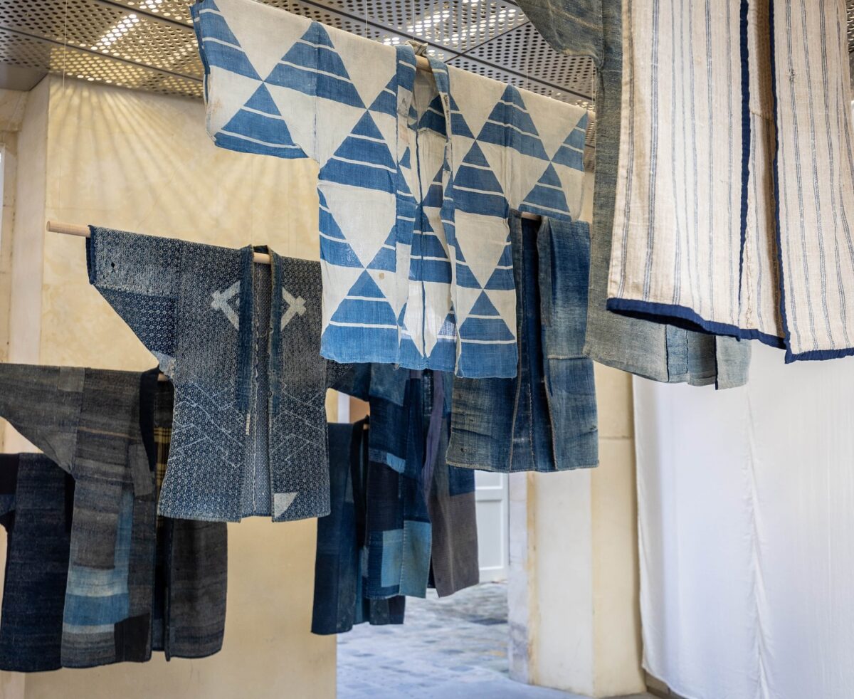 Dans un porche entre deux cours, une série de vêtements anciens sont suspendus au-dessus de nos têtes, loin de l’idée archétypale que nous avons du vêtement traditionnel japonais. Ici, ce sont des vestes de travailleurs modestes du 19ème siècle, teintés à l’indigo et faits de fibres naturelles telles que le chanvre, présentées par Go for Kogei. Ces vêtements représentent l’idée de Mingei, la beauté de l’artisanat traditionnel qui se déploie dans l’austérité du quotidien, avec des matériaux faciles à trouver autour de nous et créé en suivant d’abord la fonctionnalité.