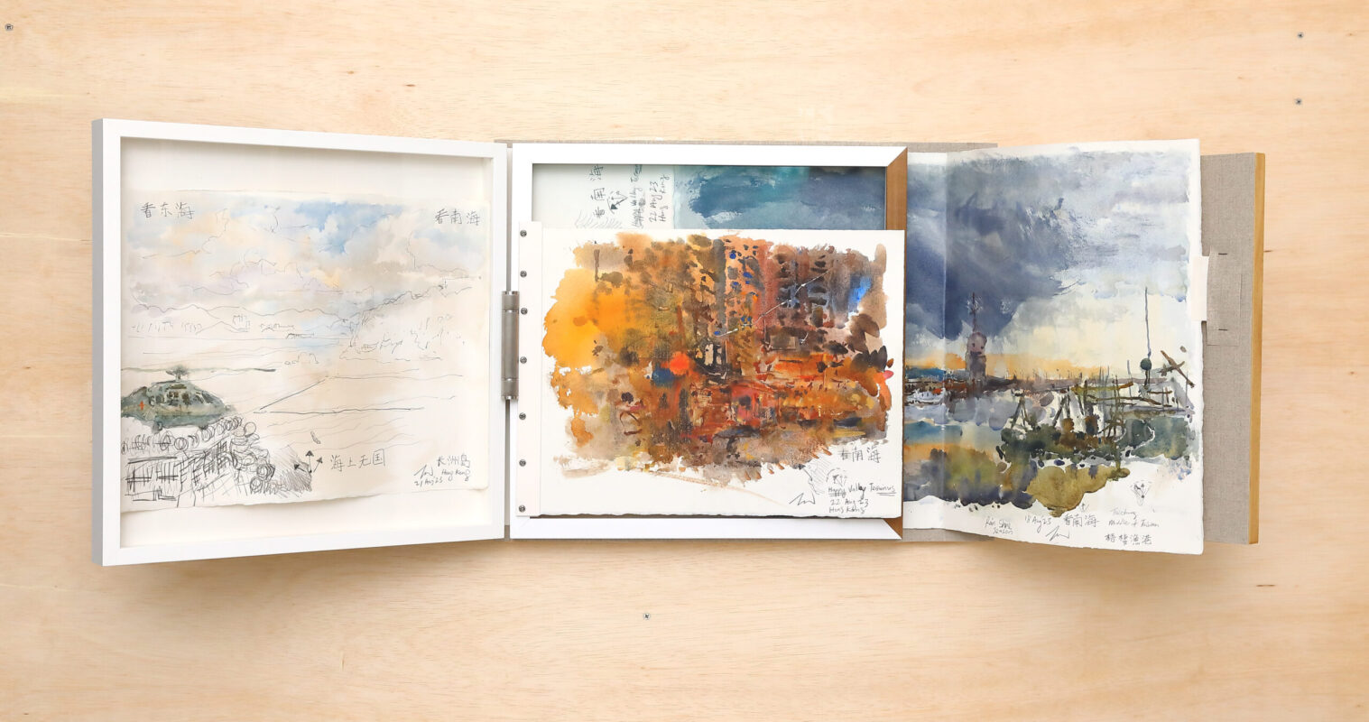 Terminons enfin avec le travail d’un artiste itinérant présenté par Yeo Workshop (Singapour), The seas are all shared, de Ng Joon Kiat. Il explore par ses aquarelles la question des frontières et des nationalités, mélangeant dans les boîtes-livres-chevalet de voyage qui contiennent ses peintures les différents pays dans lesquels il a voyagé. Il crée ainsi une image d’un monde globalisé, dont les détails identitaires ne se distinguent pas dans ses œuvres.