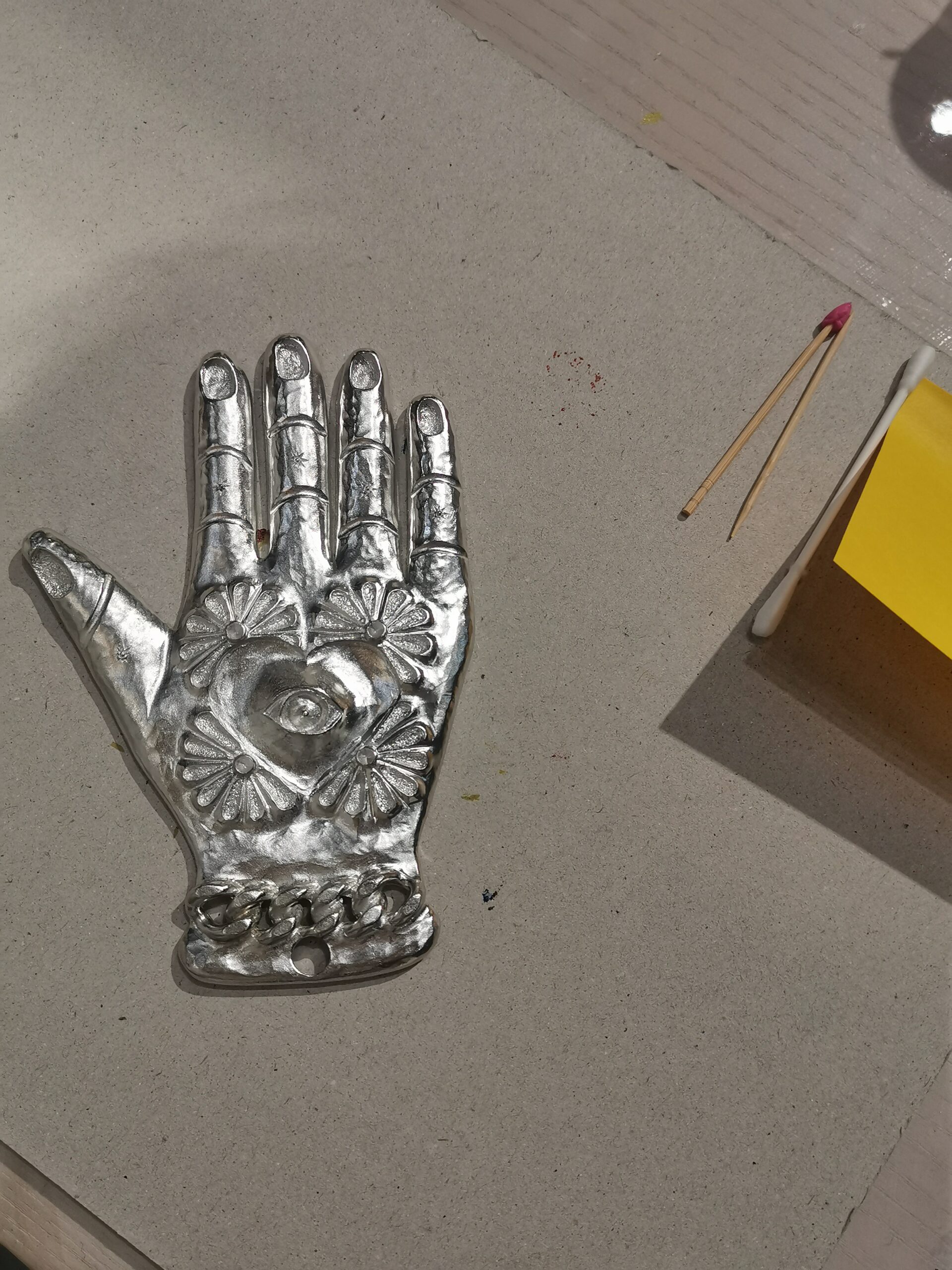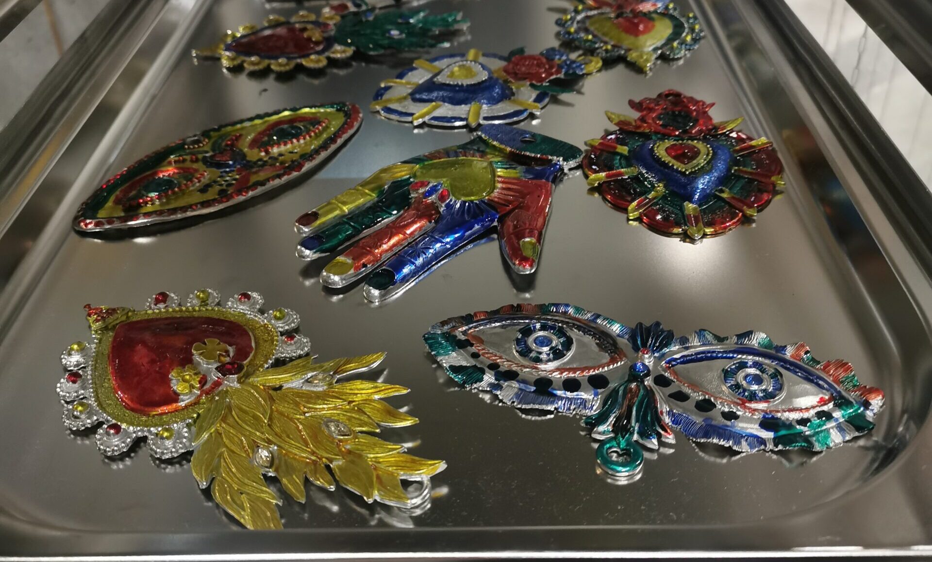 Suite à ces pistes de raisonnement, il fut alors proposé à l’auditoire de prendre part à un atelier de peinture collaboratif sur des milagritos en étain créés par la maison Goossens au cœur du 19M, avec une peinture proche de celle utilisée sur les vitraux. Des milagritos qui rejoindront ensuite une œuvre d’art amenée à voyager au même rythme que l’exposition dédiée à Carla Fernández à travers le monde. Il fallait y mettre de l’intention, choisir entre une main, pour l’artisanat, un œil ou un cœur, pour voir avec ce dernier. Un moment chargé de concentration et d’émotions dont tout un chacun sortit apaisé.