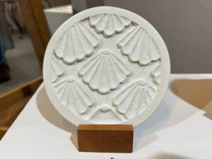 Pour le salon, celle qui s’est formée en 2020 dans la création et l’ornement sur pierre présente « des pièces déjà en stock, car tout créer sur mesure prend beaucoup de temps ». Elle a aussi préparé des médaillons dans la thématique. « Je les ai créés avec la pierre de Richemont, une pierre calcaire assez tendre. J’ai convoqué les formes géométriques et les motifs qui se répètent, propres à l’art déco », explique-t-elle. Même si elle avoue ne pas bien connaître ce mouvement artistique né au XIXe siècle, elle apprécie le « côté moderne » que ces créations donnent à la pierre.