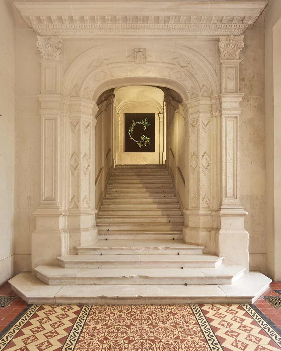Dans les salles du château, où la rénovation est partielle et laisse voir le passage du temps par endroits, Bertrand Gadenne a choisi d’exposer deux séries : La Branche d’arbre et Les Hydrangeas. Récoltées dans le parc, les branches sont couvertes de mousses et de lichens, créant un paysage recomposé fourmillant de détails, mais évoquant la décomposition. Il s’inscrit dans la droite ligne de l’histoire de la nature morte et des vanités, mais ces memento mori sont paradoxaux. En effet, si la présence de mousses sur un arbre peut suggérer le passage du temps, le cycle du pourrissement qui transforme la branche en nutriments pour de nouvelles formes de vie, elle est également le signe que l’arbre pousse très lentement, comme certains camélias centenaires du parc peuvent en témoigner. Ainsi, certaines parties du château semblent en ruines, mais elles sont la base pour la création d’œuvres contemporaines et pour imaginer l’évolution future du bâtiment.