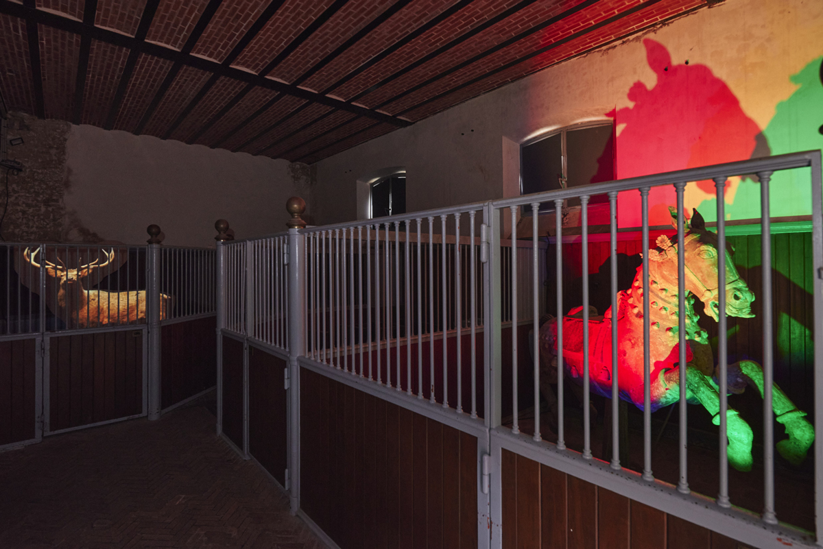 C’est donc dans ce cadre remarquable que Bertrand Gadenne est venu s’installer pour une carte blanche, succédant à des artistes comme, l’année dernière, Felice Varini, Shigeko Hirakawa, Eva Jospin, Bob Verschueren ou Raija Jokinen. L’artiste a chaque année une liberté totale concernant son intervention, et Bertrand Gadenne a choisi de s’intéresser à la faune et à la flore, dans la lignée de sa pratique. Il a mélangé des vidéos existantes et un travail photographique inédit créé pendant sa résidence au Domaine et s’est installé en intérieur, dans le château et les écuries.