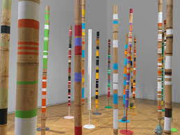 Andrea Branzi (1938-2023), Bamboo Interior Wood, 2023 Bambou, peinture acrylique, roche, fer vernis, 30 bambous peints variant entre 279 x 30 cm et 309 x 30 cm Centre Pompidou, Paris, Musée national d’art moderne / Centre de création industrielle, don du Fonds Meyer Louis Dreyfus, Amis du Centre Pompidou en 2024 © Centre Pompidou, MNAM-CCI/Audrey Laurans/Dist. GrandPalaisRmn.
