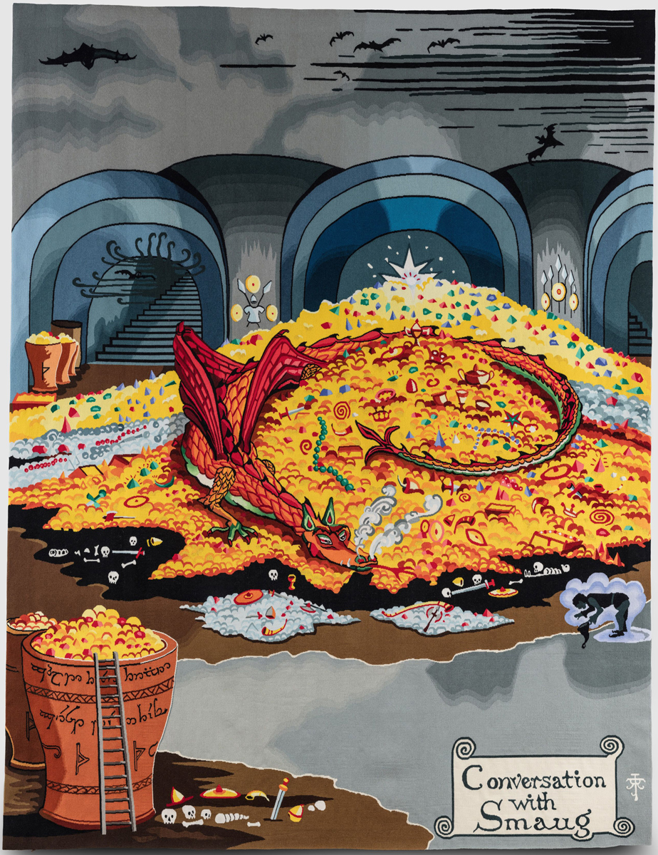 3- Conversation with Smaug, d’après une aquarelle originale de J. R. R. Tolkien pour The Hobbit, 1937 © The Tolkien Trust 1977 – Carton Delphine Mangeret et Anne Boisseau – Tissage Atelier A2, Aubusson 2022 – Coton (chaîne) ; laine et fils métalliques (trame) H. 322,5 ; l. 249 cm, Aubusson, Cité internationale de la tapisserie © The Tolkien Trust 1977 © Tissage Atelier A2 / Aubusson 2022 © Collection Cité internationale de la tapisserie / Photo Studio Nicolas Roger